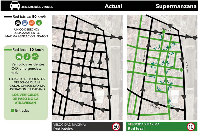 La supermanzana desplaza la dependencia del automóvil hacia el exterior, y supone una mejora evidente del espacio público para los ciudadanos, de los niveles de contaminación atmosférica y de la disminución de ruido. Forma parte de nuevo modelo urbano que en la actualidad tiene posibilidades de desarrollarse con motivo de las crisis sanitaria y climática.