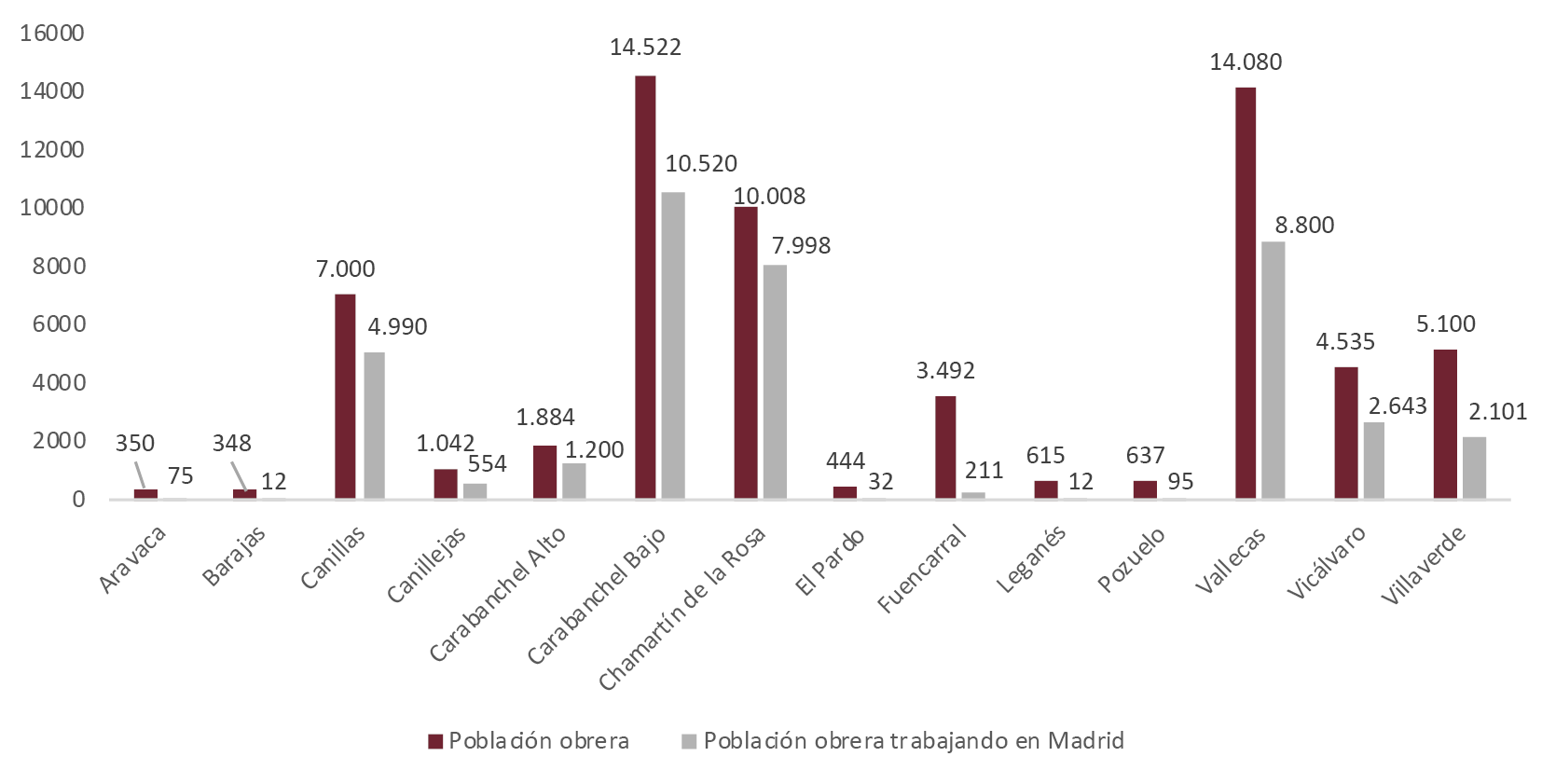 Las principales aristas del citado proceso de anexión son bien conocidas, en lo que respecta a su desarrollo legislativo y sus repercusiones administrativas y sociopolíticas (García Martín, 1991; Fraguas, 2018). Mas también resulta posible una mayor problematización sobre sus orígenes, que ponga de relieve el estrecho marco de relaciones que con el paso de los decenios fue estableciéndose entre la capital española y los núcleos poblacionales más próximos a ella. El crecimiento demográfico de estos últimos (Fig. 1), proporcionalmente comparable al experimentado por Madrid durante el primer tercio del siglo XX y explicado por la forma en que se convirtieron en un espacio propicio para el asentamiento por su exiguo coste, motivaron una confluencia de intereses económicos y sociales entre uno y otros ámbitos entre el primer decenio del Novecientos y la Guerra Civil. Importantes porcentajes de los habitantes de municipios como Vallecas, Chamartín de la Rosa, Vicálvaro, Carabanchel Alto o Carabanchel Bajo, entre otros, cubrían sus necesidades en los barrios de la gran urbe, creando unos nexos que difuminaron la discontinuidad entre unas zonas y otras.
