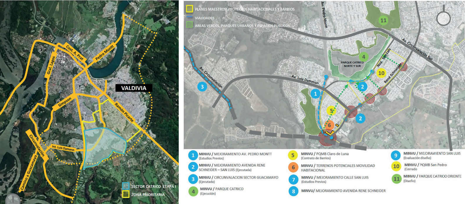 Interesante también es el caso de la Ciudad de Valdivia en el sur de Chile (Fig. 7 y 8), caracterizada geográficamente por ser un territorio de expansión urbana que se ha desarrollado entre humedales de gran riqueza medioambiental y paisajística. Por estos hechos, la Zona de Interés Público denominada Angachilla, se caracteriza como un sector que ha acogido diversos proyectos de vivienda pública desarticulados entre ellos, los humedales y las infraestructuras urbanas, determinando la ausencia de continuidad urbana y un alto deterioro.