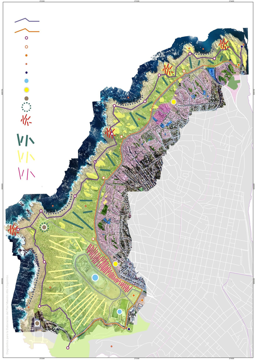 A modo de ejemplo, podemos observar la imagen objetivo y plan maestro de la Zona de Interés Público desarrollada para la Parte Alta de la Ciudad de Coquimbo (Fig. 4, 5 y 6), la que, como resultado de un diagnóstico integrado ha pasado a constituirse en la primera fase de un proceso que apuesta por el trabajo desde la escala intermedia. La ZIP destaca geográficamente por su configuración como península, así como por la configuración de una trama urbana que es resultado de ocupaciones irregulares y espontáneas que se fueron consolidando en el tiempo en el sector oriente, pero que aún persisten en la ladera poniente. Por su carácter de enclave en la ciudad, en la actualidad la ZIP acoge algunos elementos de carácter turístico con mayor o menor consolidación, como es la “cruz del milenio” en la cumbre de la península, la denominada popularmente “pampilla” que, como un área de gran superficie es reconocida y valorada por los habitantes de la ciudad como espacio de encuentro principalmente en el periodo de fiestas patrias, así como la propia ladera poniente, que, sin ni un grado de consolidación urbana, cuenta con la presencia de diversa flora y fauna y una vista privilegiada hacia el mar.