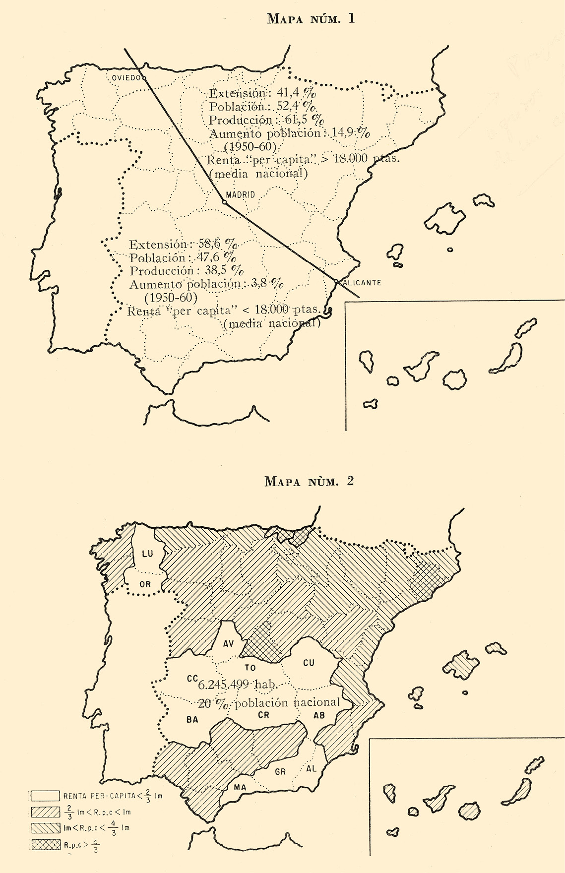 González Paz concluyó en 1963 que las regiones atrasadas del país eran Canarias, Aragón, Andalucía, Duero, Noroeste y Extremadura, las regiones medias eran Centro y Levante, y las regiones adelantadas eran Nordeste y Cantábrico (González, 1964: 154), y ya se ha dicho que el Plan de Desarrollo identificó como zonas insuficientemente desarrolladas a Galicia, valle del Duero, valle del Ebro, Centro y Andalucía.