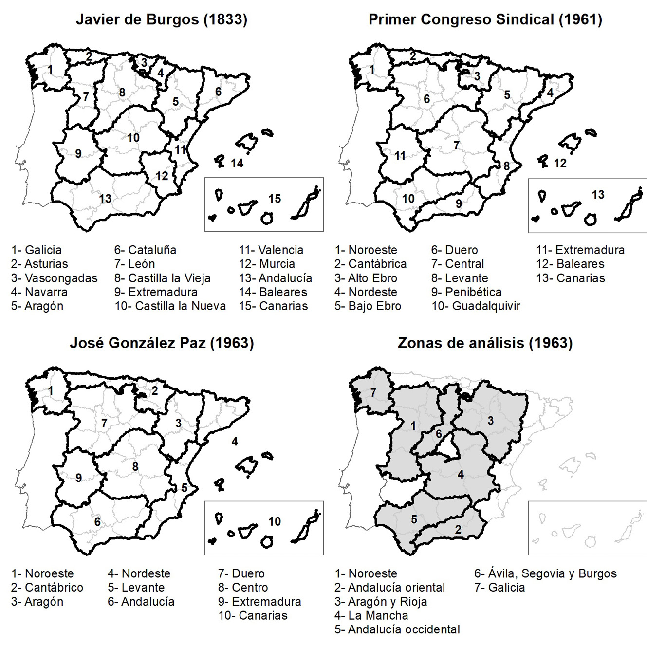 El Real decreto sobre la división civil del territorio español, es decir, la provincialización de Javier de Burgos de 30 de noviembre de 183312, estableció las provincias referenciando sus regiones (Burgueño, 1996: 211-214), que fueron asumidas un siglo más tarde en la Ley del Tribunal de Garantías constitucionales de 24 de junio de 193313. Ya en el periodo de referencia, a raíz del Primer Congreso Sindical de 1961, la Organización Sindical incluyó el tema “Criterios para el desarrollo económico de España”, en el que se señalaban trece agrupaciones provinciales en tanto regiones socioeconómicas (Delegación de Prensa y Propaganda del Movimiento, 1962), sin contar las provincias africanas.