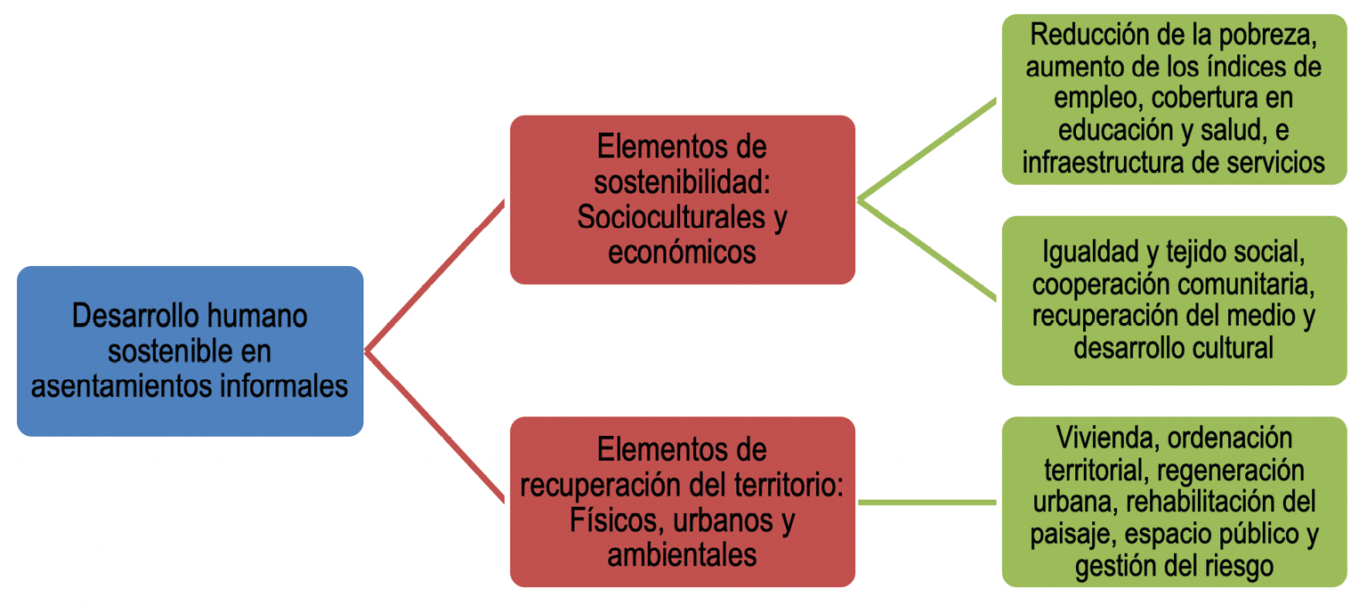 El proceso de regeneración urbana debe responder a una resolución integral de los problemas urbanos, buscando resolver las falencias en el ámbito económico, físico, social y ambiental. Es decir, el entorno urbano se entiende como un elemento compuesto por pequeñas subelementos que permiten el desarrollo humano. El éxito de la regeneración urbana requiere de un enfoque integral en que se contemplen aspectos legales y financieros, y cuestiones de carácter físico-espacial, incluyendo como elementos estructuradores las perspectivas social y medioambiental (ONU-Hábitat, 2016). Por lo tanto, dicho proceso debe dar respuesta a través de una sola intervención a todas las necesidades que se manifiestan en el entorno urbano, en este caso en los asentamientos humanos informales;