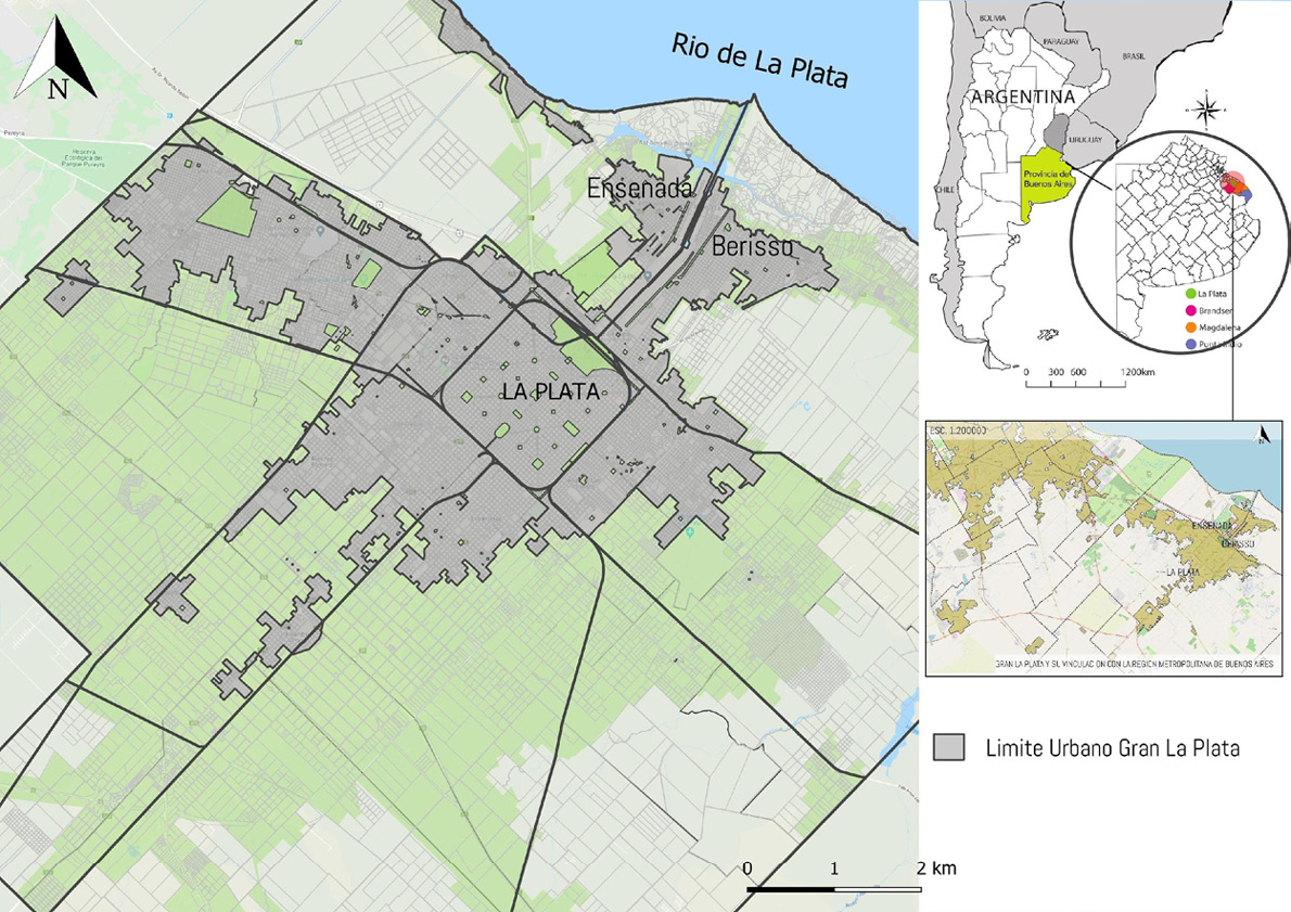 La denominada Microrregión del Gran La Plata (Fig. 1) corresponde al conglomerado urbano que forma parte del Área Metropolitana de Buenos Aires (AMBA) e incluye a los Partidos de Ensenada, Berisso y La Plata (capital de la Provincia de Buenos Aires). Entre los tres partidos suman 890.000 habitantes, aproximadamente, según estimaciones propias basadas en los porcentajes de crecimiento de los últimos cuatro censos nacionales, y de los padrones electorales de 2019.