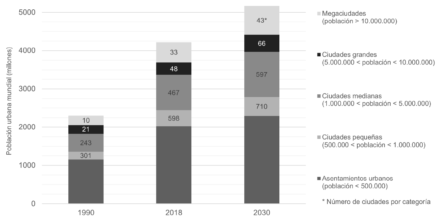 El conjunto de ciudades y regiones metropolitanas ha crecido a un ritmo sin tregua ni precedentes desde el final de la última Guerra Mundial, prácticamente sextuplicando su número de habitantes hasta la fecha y concentrando más del 55% de la población de la Tierra ya en el año 2018. En las próximas tres décadas se prevé el traslado de otros dos mil quinientos millones de personas a núcleos urbanos (United Nations, 2019), cuya migración se espera agudice la presión sobre materias primas y energía, intensifique el impacto ambiental alrededor de las mismas y multiplique la desigualdad entre sus ciudadanos. La pregunta más obvia trata de encontrar una solución al abordaje de dichos desafíos relacionados con la sostenibilidad urbana –presión demográfica, limitación de recursos, desigualdad social y calentamiento global– en un contexto de rápida urbanización (Fig. 1) del que somos tanto testigos como actores protagonistas.