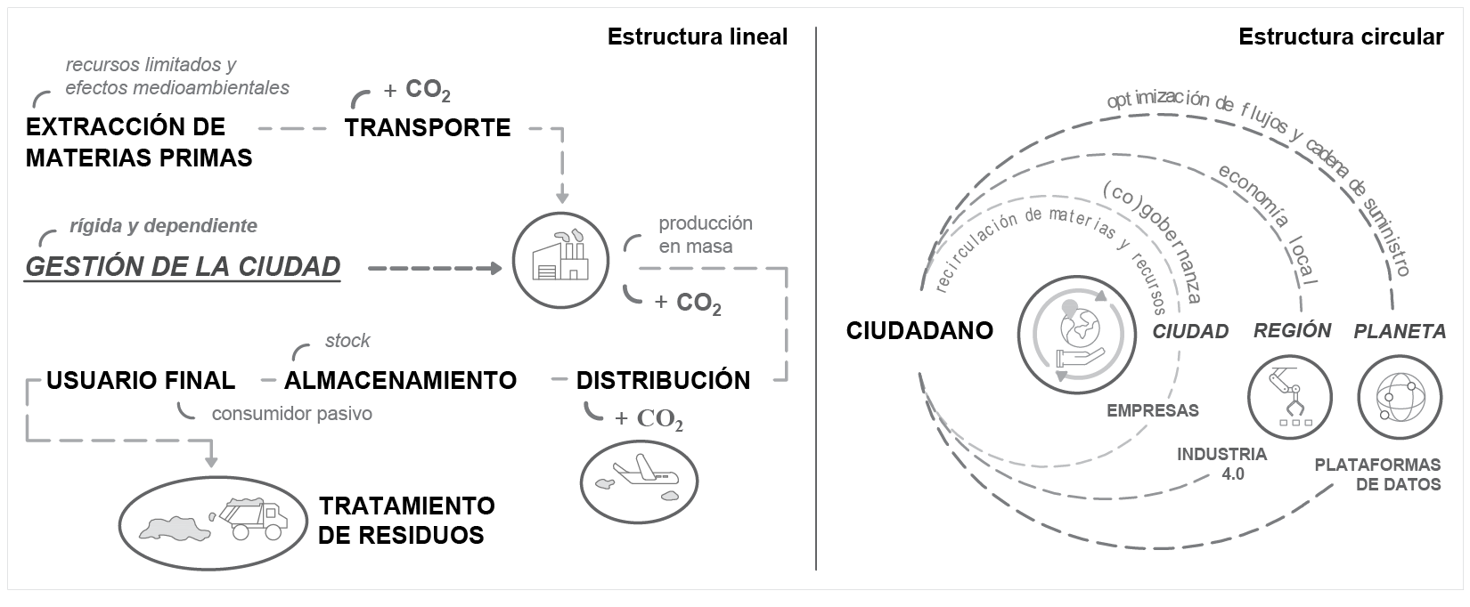 Fig. 4/ Flujo de recursos en metabolismos urbanos lineales y circulares.