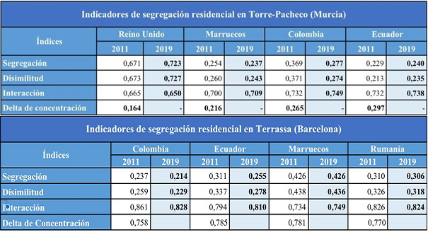 La distribución poblacional en las ciudades y municipios de España no es azarosa y, probablemente, no exista ningún fenómeno que haya podido ratificar la afirmación previa de una manera tan clara y evidente como la llegada de Población de Origen Inmigrante (POI) a territorio español. En este sentido, el estudio de la exclusión/inserción residencial de la POI es de una importancia capital en sus procesos de asentamiento e integración en los países receptores, ya que influye decisivamente en su futuro desempeño en la sociedad, así como en la consideración pública del fenómeno migratorio. Lo que hace relevante el presente análisis de segregación residencial es la comparación entre un entorno urbano de alta diversidad y densidad poblacional, el barrio de Ca n’Anglada, en Terrassa, frente a un entorno rural, pero de alta diversidad, como Torre-Pacheco, en la Región de Murcia.