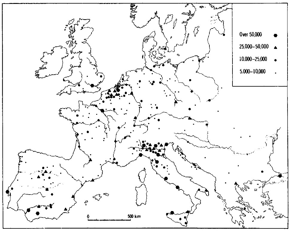 El desarrollo urbano en el continente lo protagonizaron ciudades de menos de 5.000 habitantes. Así, por ejemplo, en Italia, entre los siglos XI y XII, se crearon alrededor de 2.000 asentamientos, la mayoría de los cuales no podían considerarse ciudades, pero que refleja el proceso de urbanización que estaba en marcha (Becker, 1981, p. 15). Hacia 1200 ya había en Italia entre 200 ó 300 ciudades-Estado diferentes (Waley, 1969, p. 11), y al menos 20 ciudades con 20.000 habitantes o más (Anderson, 1974, p. 46; Schumann, 1986, pp. 103 y siguientes), mientras que en Alemania existían 69 ciudades libres en el sur (Brady, 1985, p. 10). Esto guarda relación con el desarrollo de la economía de mercado europea impulsado por el comercio de larga distancia de los señoríos (Brutzkus, 1943; Postan, 1975, p. 205-208). La economía señorial contribuyó así a impulsar el comercio medieval debido a la demanda de bienes suntuarios, lo que estaba unido a la aparición de ciudades (Pirenne, 1952, pp. 122, 132; Werveke, 1963; Hohenberg & Lees, 1985, p. 38; Le Goff, 1988, p. 78; Spruyt, 1996, p. 62). Este proceso de desarrollo comercial, que algunos han llegado a calificar como una revolución comercial (Lopez, 1976), unido a las condiciones geográficas antes señaladas, es lo que explica el aumento del número de ciudades grandes. De este modo en el año 1000 había en Europa 29 ciudades con al menos 5.000 habitantes. No fue hasta casi dos siglos después que esta cifra ascendió a 127 (Bairoch & Baout & Chèvre, 1988; Moore, 2003, p. 52). De hecho, la proporción de población que vivía en ciudades de 10.000 habitantes o más era de aproximadamente el 5% en el año 990. Tal es así que en ese mismo año se contaban 111 ciudades de ese tamaño, mientras que en 1490, ya en la época moderna, la cifra había ascendido a 154 en total (Vries, 1984, pp. 29-48; Bairoch, 1985, pp. 182, 282). Sin duda se trata de un crecimiento lento, pero que en cualquier caso refleja la consolidación de la red urbana europea, aunque hay que señalar que algunas de estas ciudades grandes se ubicaban en los márgenes del área geográfica que aquí es objeto de estudio.
