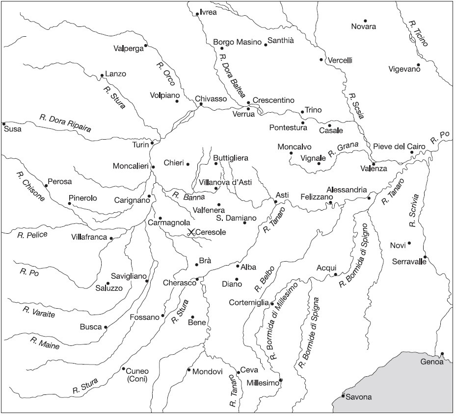 Fig. 2/ Mapa del noroeste de Italia que muestra su red fluvial a lo largo del curso del río Po y las diferentes ciudades que interconectaba en el s. XVI