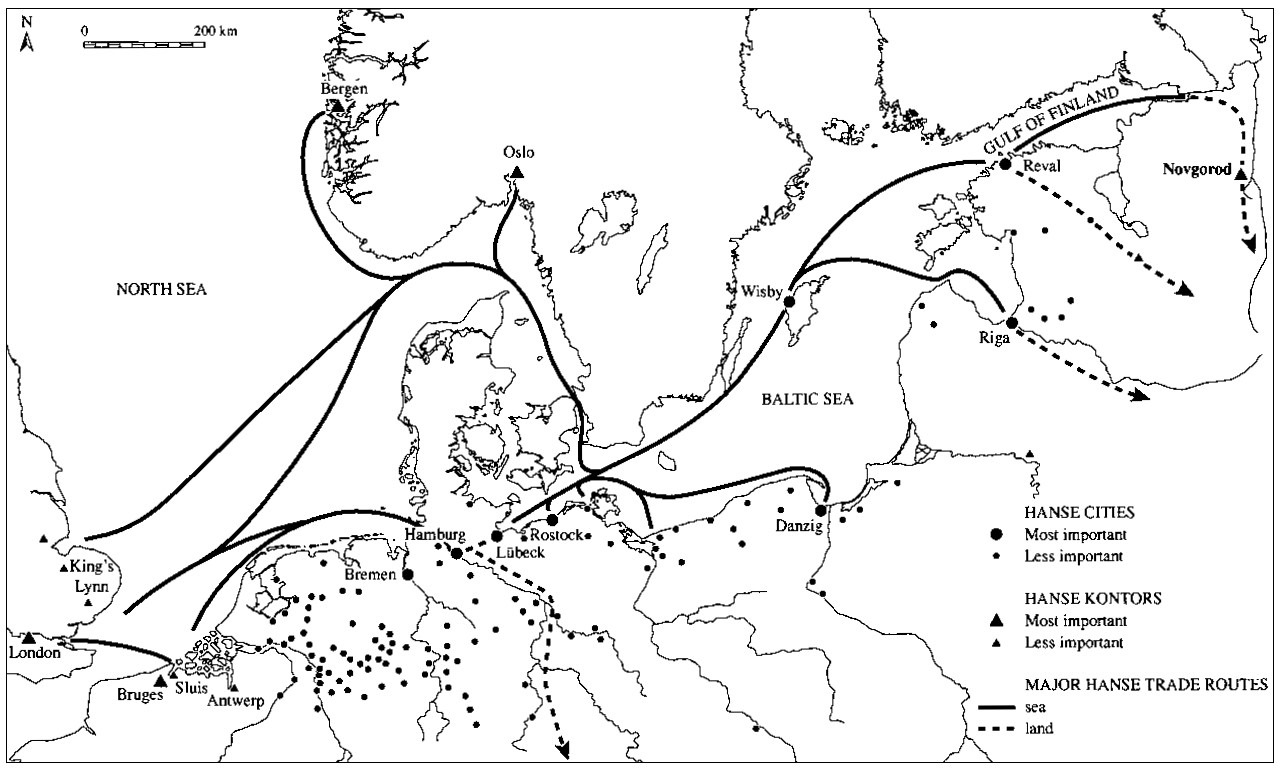 Así pues, podemos hablar de una red urbana no sólo porque existía una gran cantidad de ciudades en Europa occidental, entre el norte de Italia y el Mar del Norte, sino porque también mantenían unas intensas relaciones comerciales entre ellas, al mismo tiempo que participaban en el comercio mundial. De esta forma, las ciudades europeas, a través de sus múltiples interacciones, desarrollaron una serie de dinámicas y de energías sociales, políticas, económicas y de diferente tipo, que fueron el resultado tanto de unas condiciones geográficas favorables, como de la ubicación geográfica de esta misma red al ser un punto de convergencia y cruce de comunicaciones que facilitaron las interacciones y actividades comerciales, culturales y políticas. Comprobamos, entonces, que la red fluvial y las rutas terrestres que conectaban el comercio intereuropeo, junto a la proximidad de las costas marítimas, pusieron en contacto los flujos comerciales transcontinentales, lo que favoreció tanto la formación como el desarrollo y posterior consolidación de la red urbana europea.