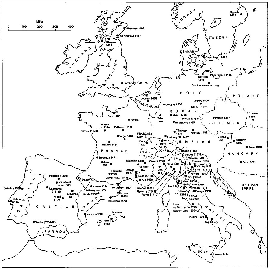 Fig. 6/ Ciudades universitarias medievales. Las divisiones políticas corresponden a 1490