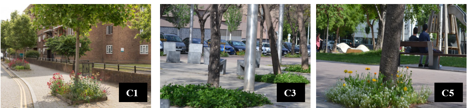 Alcorques vivos, en los que junto con el árbol se deja crecer vegetación herbácea espontánea, reduciéndose la frecuencia de siegas y el uso de biocidas |