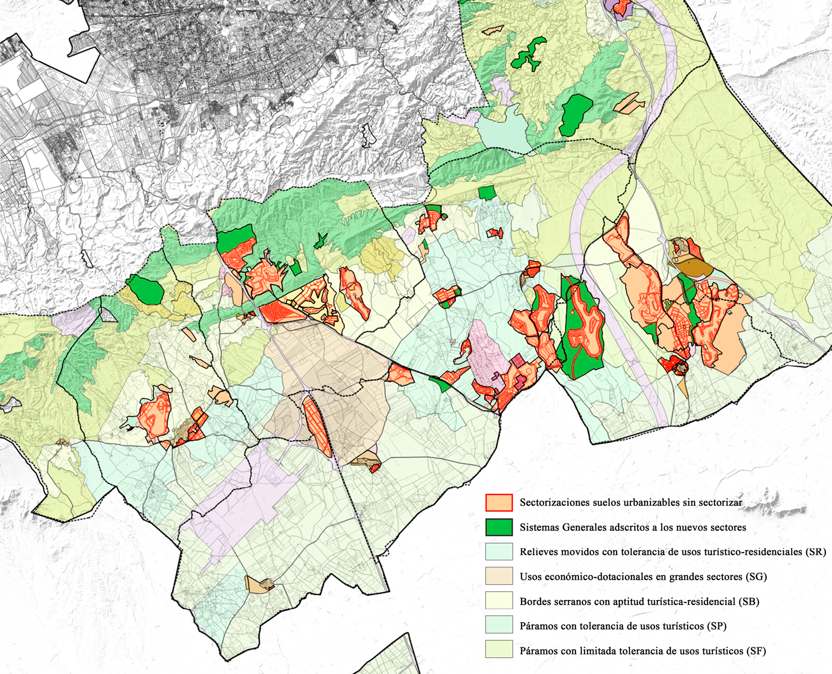 A pesar de ello, no hubo una prescripción cuantitativa de las superficies máximas desarrollables mediante estas actuaciones en este tipo de suelos. Y, en la práctica, se superaron ampliamente la descripción cualitativa del tipo de desarrollo de estos suelos: las actuaciones que se sectorizaron en los páramos, los suelos SP y SF (sin incluir sus sistemas generales), representaban el 20,1 y el 28,3% del área total de éstos.