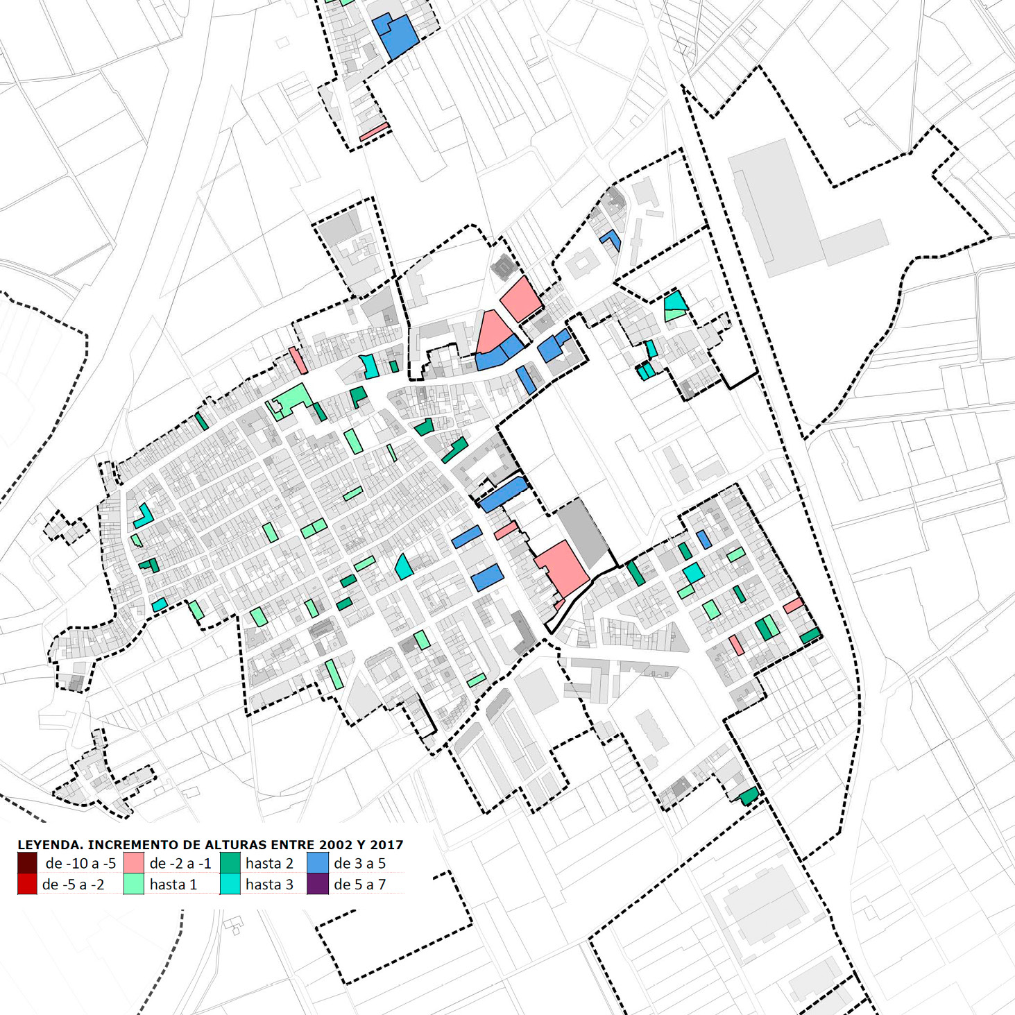 Para la evaluación de estas transformaciones, producidas principalmente en los tipos definidos para el casco histórico de Murcia (MC), el casco antiguo de pedanía (RC) y la manzana cerrada tradicional (RM), se ha empleado la cartografía catastral de suelo urbano de Murcia, que incluye todas las alteraciones en esta base de datos desde su primera versión, permitiendo reconstituir el estado de los volúmenes construidos, según catastro, en cualquier fecha desde el inicio. Al estar comparando el cambio de alturas por sustitución de la edificación y existir numerosos cambios en el parcelario, sólo se ha tenido en cuenta aquellas parcelas en las que a fin de 2001 había más de 40 m2 ocupados por construcciones y en las que el cambio en la altura media ha sido superior a 0,7 plantas.