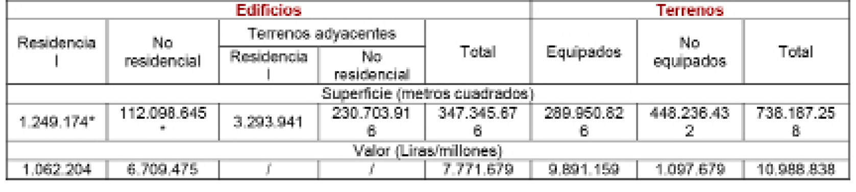 Más de una década después, el Decreto del Presidente del Consejo de Ministros de 15 de octubre de 1985 instituye la “Comisión de Investigación sobre el Patrimonio Inmobiliario Público”, la llamada “Comisión Cassese” con la tarea de llevar a cabo una encuesta sobre los bienes inmuebles públicos (Cassese, 1986). Dos años de trabajo llevan al primer censo, aunque aproximativo, del patrimonio inmobiliario público italiano (Carrer, 1988) 4. La Comisión Cassese publica algunos datos sobre el patrimonio perteneciente al Ministerio de la Defensa, es decir, la suma de las superficies en metros cuadrados y su valor monetario, distinguiendo el patrimonio poseído entre edificaciones y terrenos (Fig. 1). Aun así, estos datos resultan inadecuados para entender la verdadera consistencia de las propiedades militares en Italia.