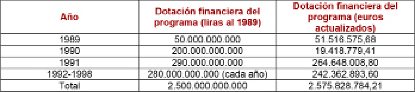La propuesta de Ley de 1989 promueve el abandono y enajenación de más de mil infraestructuras de las Fuerzas Armadas, por un total de unas 35.000 hectáreas6, para incentivar su reconversión a uso civil (público o privado) según las previsiones de los instrumentos de planificación urbana de acuerdo con las Regiones, provincias y autoridades locales (artículo 1). Se trata de un programa decenal para el abandono, la permuta y la enajenación de los inmuebles al cual debe corresponder la modernización, relocalización y construcción de nuevos cuarteles (artículo 2). En particular, se prevé la publicación de un listado de propiedades “enajenables” y su comunicación a los municipios, provincias y regiones afectadas. Si estas administraciones territoriales tienen la intención de negociar el nuevo uso público de cada inmueble, tienen un período específico de 90 días dentro del cual enviar sus peticiones para la adquisición (artículo 7) o la permuta (artículo 8). El mismo artículo 8 ordena la concesión de préstamos por parte del banco Cassa depositi e prestiti para financiar los convenios entre los entes, por un total de hasta 1.500 mil millones de liras, correspondientes a 1.545.497.270 euros. Si los entes territoriales no tienen interés en negociar la reutilización de las propiedades inscritas en el plan, se prevé la puesta en el mercado de los inmuebles a actores privados a través de subasta (artículo 9). En cualquier caso, antes de la venta, se debe estipular un acuerdo entre el Ministerio de Defensa y los organismos públicos territoriales afectados por el abandono militar, cuya finalidad es la de determinar el nuevo uso de la propiedad, que sea conveniente para la Defensa, y al mismo tiempo coherente con las necesidades socio-económicas y urbanas del contexto de ubicación. Y, finalmente, los artículos 15 y 16 organizan la dotación financiera del programa entre 1989 y 1998 (Fig. 2), para un desembolso total de 2.500 mil millones de liras (2.575.828.784,21 euros).