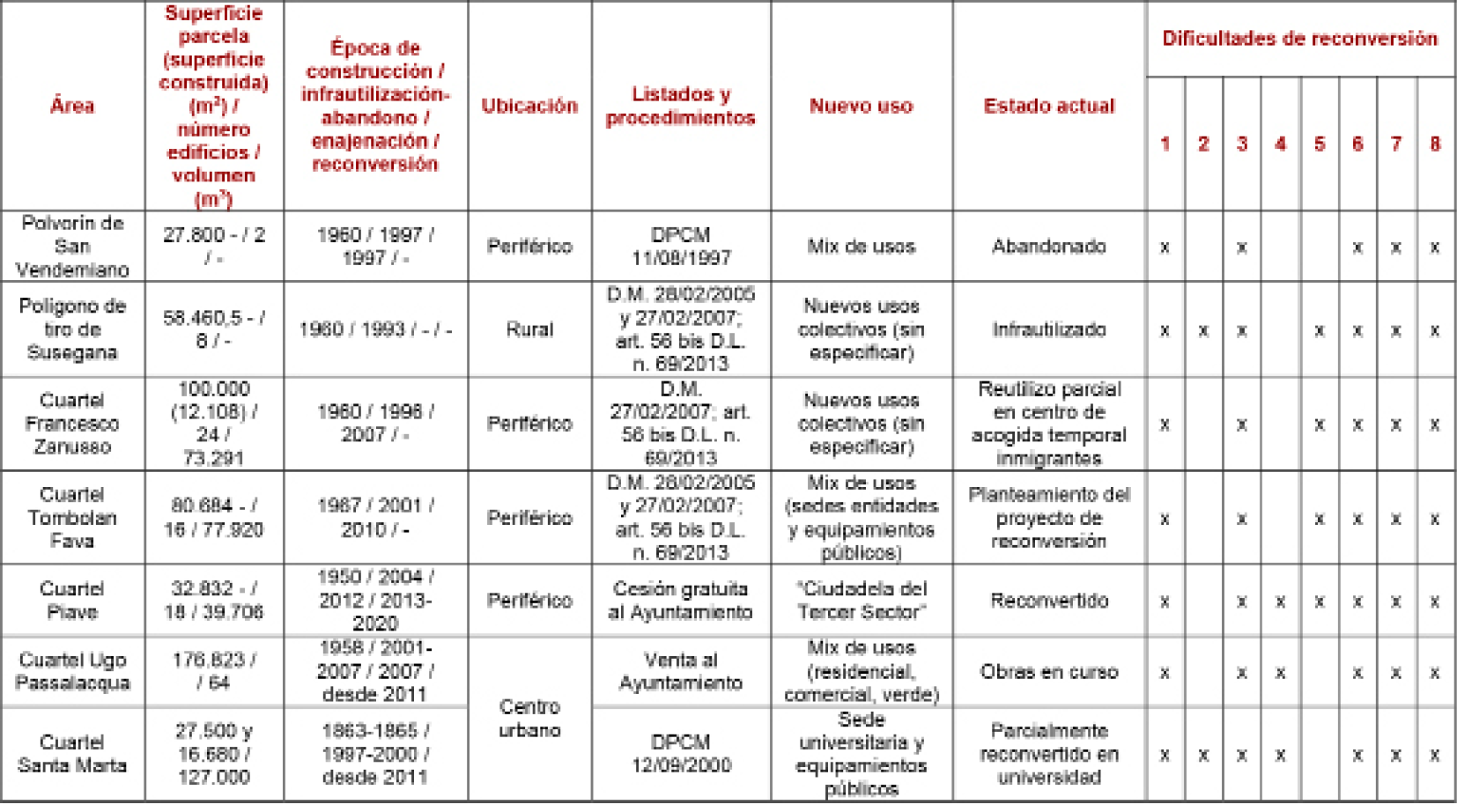 Para cada caso de estudio se señalan sus características principales (superficies, volumen, procedimiento de enajenación) y los factores detectados a partir de los informes de la Corte dei Conti (2003: 27-29 y 2017: 57) que han influenciado negativamente la puesta en marcha de la reconversión: 1. Regularización catastral de los inmuebles, en cuanto el Ministerio de Defensa no es obligado a declarar de forma completa y correcta los datos de sus bienes inmuebles; 2. Limitaciones y restricciones ambientales y de régimen especial de conservación y protección para los bienes de valor artístico, histórico y arqueológico; 3. Dificultad de coordinación entre actores públicos a nivel estatal y entre el nivel estatal y local sobre el nuevo uso; 4. Falta de una adecuada financiación, sea para reubicar las funciones militares ubicadas en el sito para enajenar, sea para proceder con el proyecto de reconversión; 5. Cuestiones de descontaminación de categorías particulares de áreas como campos de tiro, depósitos de combustible, polvorines, etc.; 6. Tiempo de espera de los Ayuntamientos para ejercer el derecho de prioridad; 7. Cambios en la normativa y en las administraciones políticas locales que han contribuido a bloquear los procesos en curso; 8. Operaciones inmobiliarias relacionadas a la necesidad de recaudar ingresos a partir de la enajenación, sin embargo estancadas debido a la contracción del mercado inmobiliario y de crisis económicas.