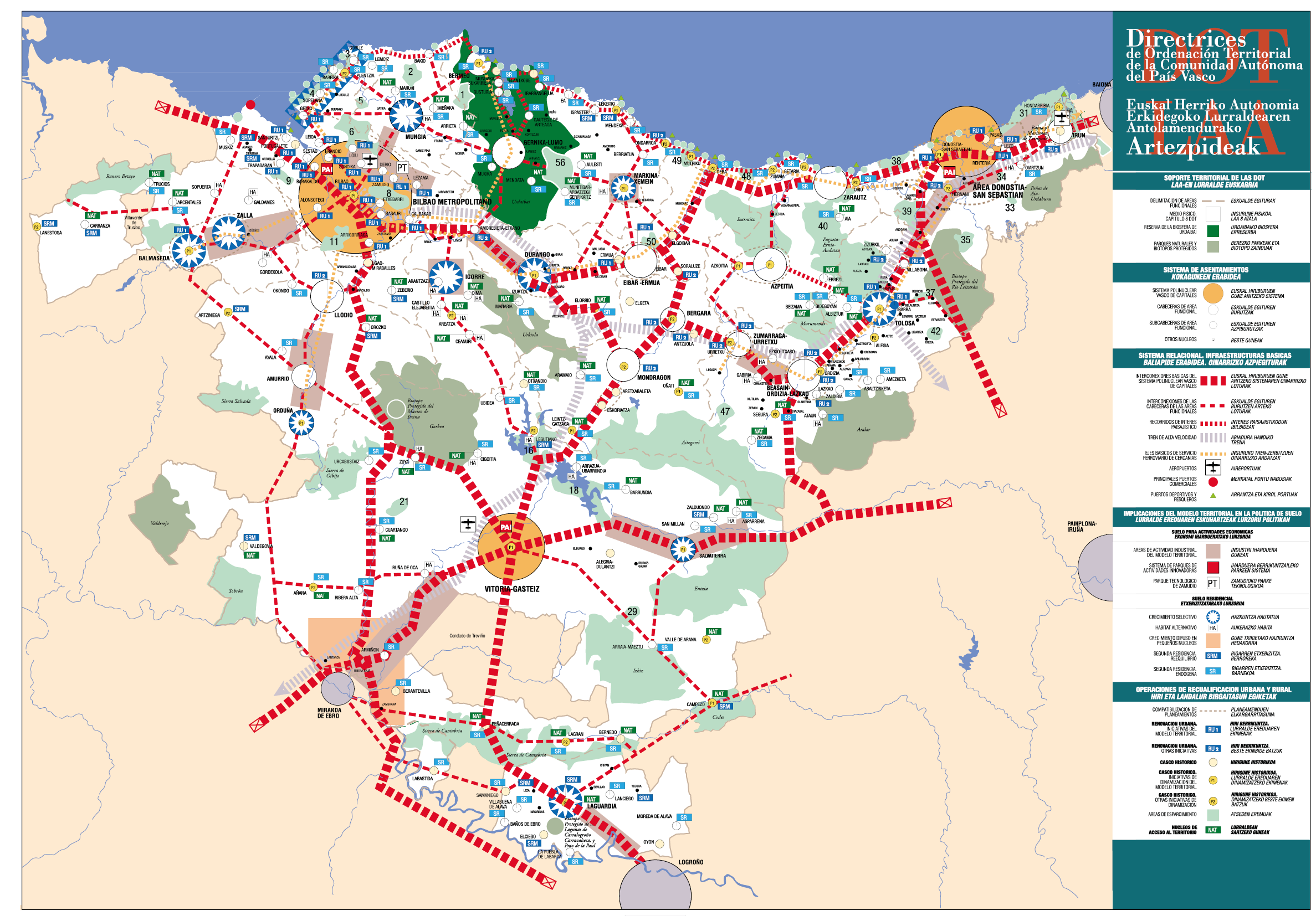 El modelo territorial de las DOT contempla acciones para integrar el sistema vasco de ciudades en Europa, para interconectar las tres capitales de Euskadi y para propiciar un mayor equilibrio y complementariedad territorial.