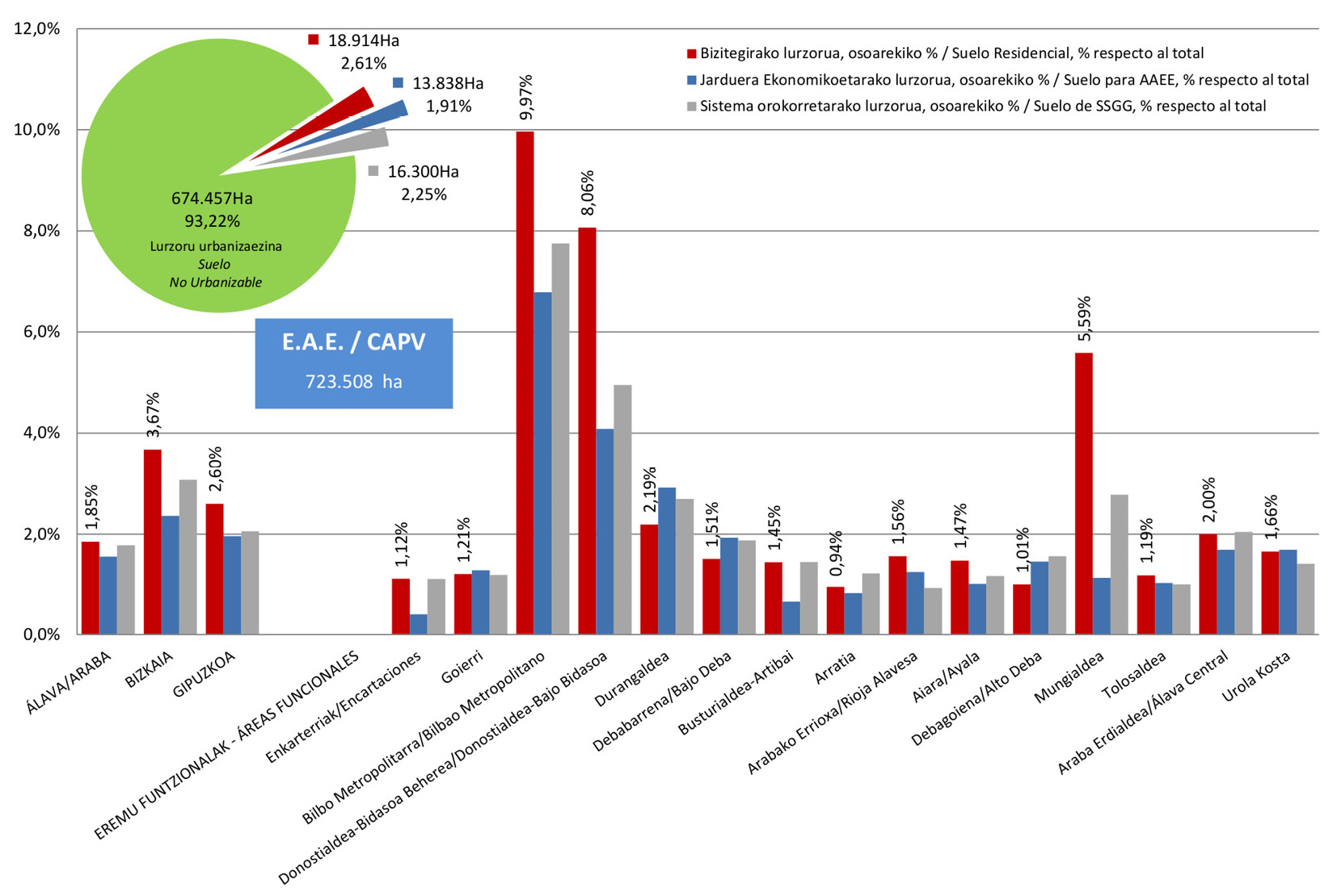 Como ya hemos comentado, el sistema urbano en Euskadi, integrado por las tres capitales junto con la red de cabeceras y subcabeceras, constituye el territorio de la CAPV donde reside más del 90% de la población, con la singularidad de ocupar tan sólo el 7% del territorio.
