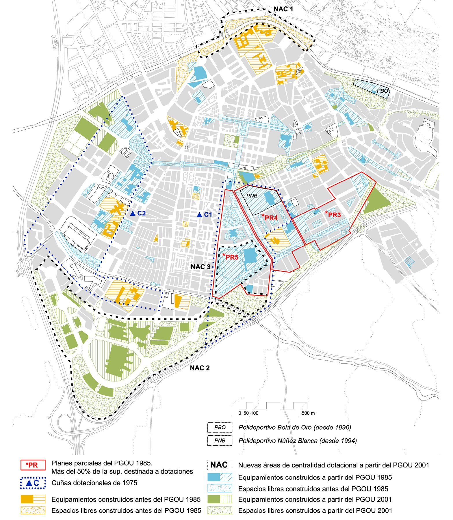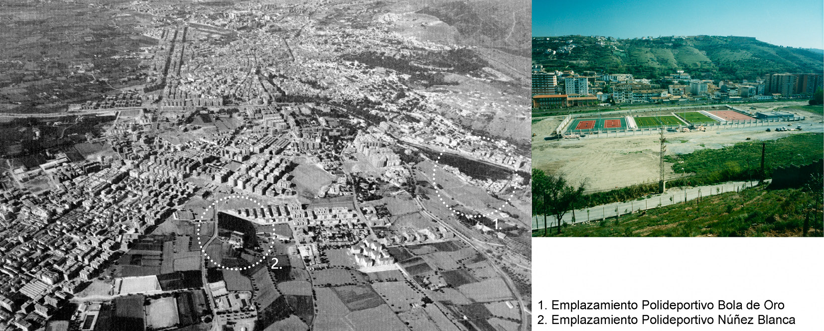 En el caso concreto de los equipamientos polideportivos Bola de Oro y Núñez Blanca, que serán objeto de observación en el apartado siguiente en relación a su inserción y relación urbanas, pertenecen, desde el punto de vista del planeamiento urbano, a las reservas de suelo para espacio libre contenidas en el PGOU de 1985, y que, en su desarrollo posterior, se concretaron en instalaciones deportivas de propiedad municipal. La diferencia entre ambos casos está en la forma en la que se determinaron las condiciones de su implantación; en el caso del polideportivo Núñez Blanca éstas se definieron por el propio plan que lo concibió integrado en la estructura viaria y en conexión con los tejidos residenciales colindantes, aunque la concreción de su diseño urbano y arquitectónico se desarrollará en el PR-4. El polideportivo Bola de Oro se ejecutó en 1989-90 como actuación aislada en un suelo reservado para espacio libre por el mismo PGOU de 1985, pero sin la cobertura de ninguna figura de planeamiento de desarrollo que definiera las condiciones de diseño urbano (posición, límites, accesos, integración con los tejidos residenciales, etc.).