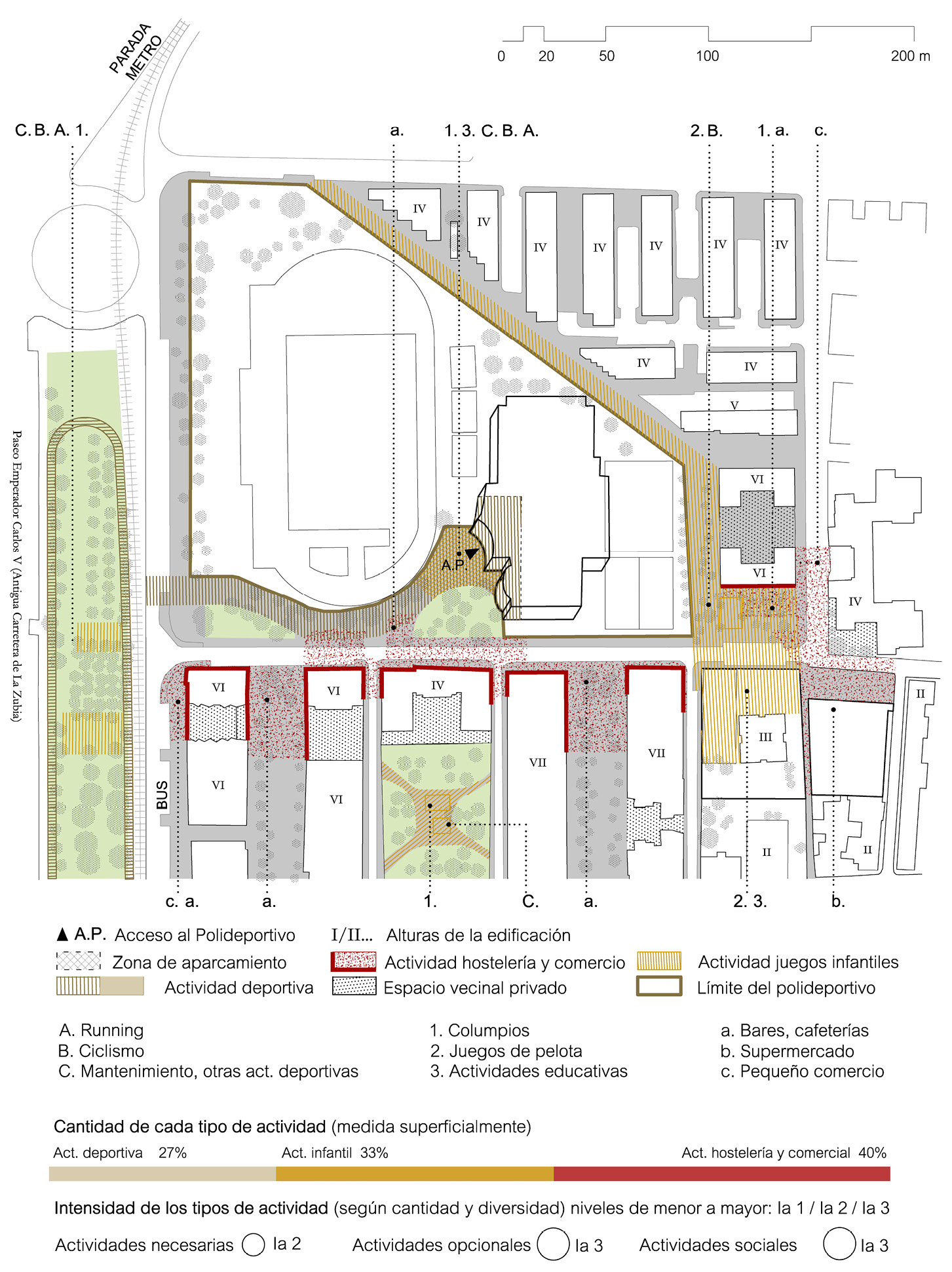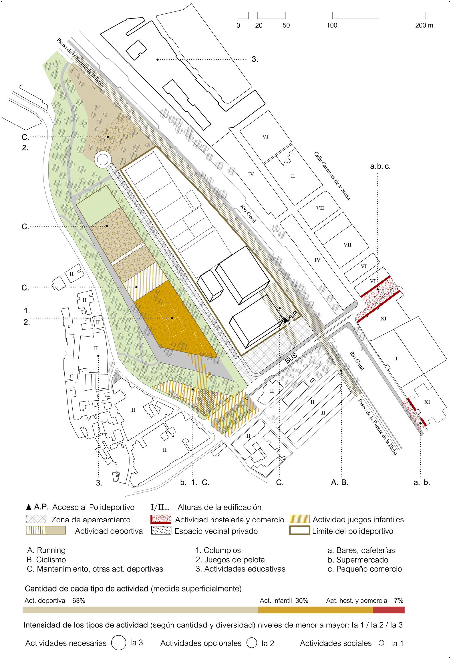 Lo que se ha observado han sido comportamientos, esto es, algo que acontece y en lo que participan personas (individuos o grupos), que actúan y que hablan entre sí y a las que se les puede ver y oír, complementado con cuestiones no intrusivas a estos usuarios por parte del investigador, acerca de sus hábitos en relación con el tema y el objeto del estudio, recogidas mediante anotaciones en un cuaderno de campo tomadas sobre tales conversaciones justo después de las observaciones. El trabajo de gabinete ha servido para interpretar las prácticas sociales de sus entornos y sus dificultades espaciales, y registrar sobre el plano la toma de información acopiada en las visitas de campo, la búsqueda documental, la fotointerpretación y el análisis urbanístico sobre cartografía base, lo que ha servido para el reconocimiento y análisis de los casos de estudio y sus ámbitos urbanos. Se han elaborado, como resultado de la propia investigación, sendas cartografías analíticas que evalúan la coexistencia de funciones urbanas secundarias asociadas a la dotación deportiva, así como las funciones resultantes de la vinculación con su entorno, tomadas en consideración mediante la determinación de la Intensidad de los tipos de actividad, o medida resultante de la combinación de la cantidad/intensidad de actividades. La comparativa se establece también en relación a las cualidades del diseño del propio equipamiento con relación a los espacios circundantes, la morfología urbana y el estudio del viario y las tramas de alrededor, y la inclusión de la dotación en redes espaciales urbanas o redes dotacionales.
