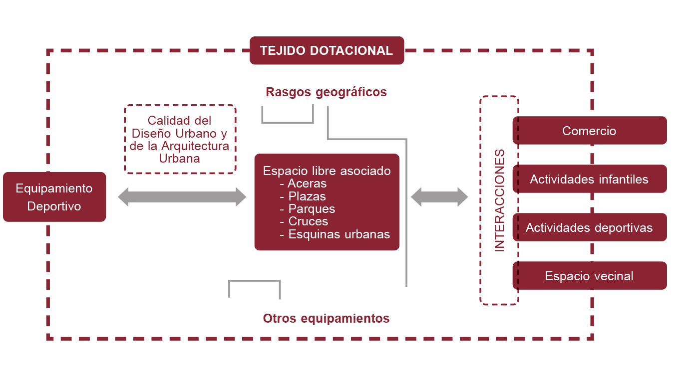 Atendiendo a lo expuesto, podríamos empezar por establecer una relación entre el incremento de los atributos a tener en cuenta en la planificación y el diseño de la implantación dotacional y los tipos de actividades que pueden llegar a desarrollarse en el espacio exterior cercano, de acuerdo con Gehl: “actividades necesarias, opcionales y sociales resultantes” (2011: 11), las cuales vienen condicionadas por las características de los ambientes exteriores a la dotación. Los equipamientos urbanos, indefectiblemente integrados en el espacio colectivo, pertenecen precisamente a ese conjunto de actividades necesarias que los ciudadanos requieren y desarrolla y que, con unas condiciones óptimas del espacio libre próximo, pueden potenciar el desarrollo de actividades opcionales alrededor y otras resultantes de tipo social, producto de la interacción entre la dotación y otros usos urbanos del entorno. De esta forma, quedaría amplificada la capacidad de estos espacios hiperpúblicos, favorecidos llegado el caso por la positiva multiplicación de actividades en los entornos dotacionales.
