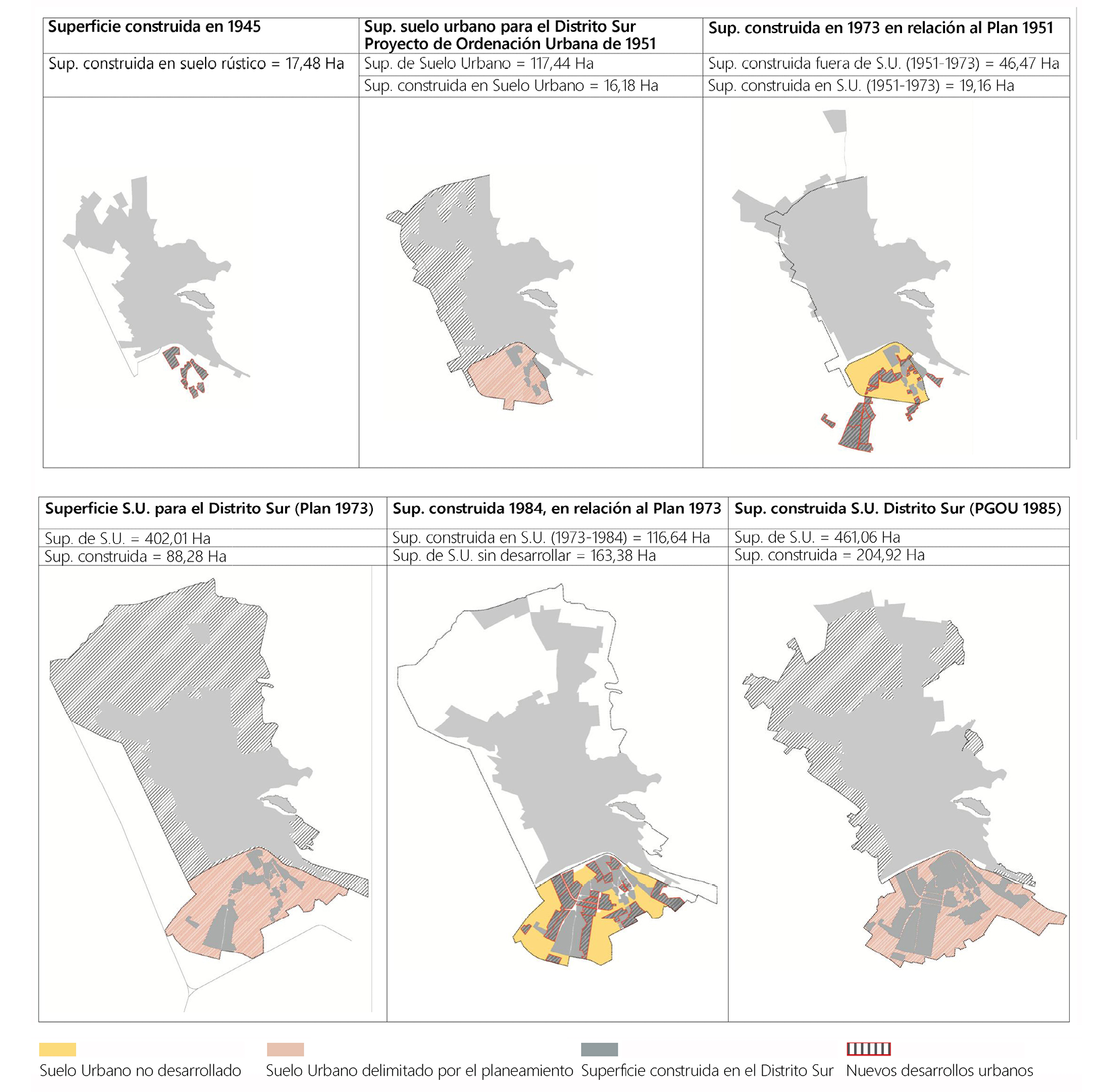 Fig. 1/ Relación entre el proceso de construcción y la delimitación del planeamiento para el Distrito Sur de Granada, periodos 1945-1951 y 1973-1985.