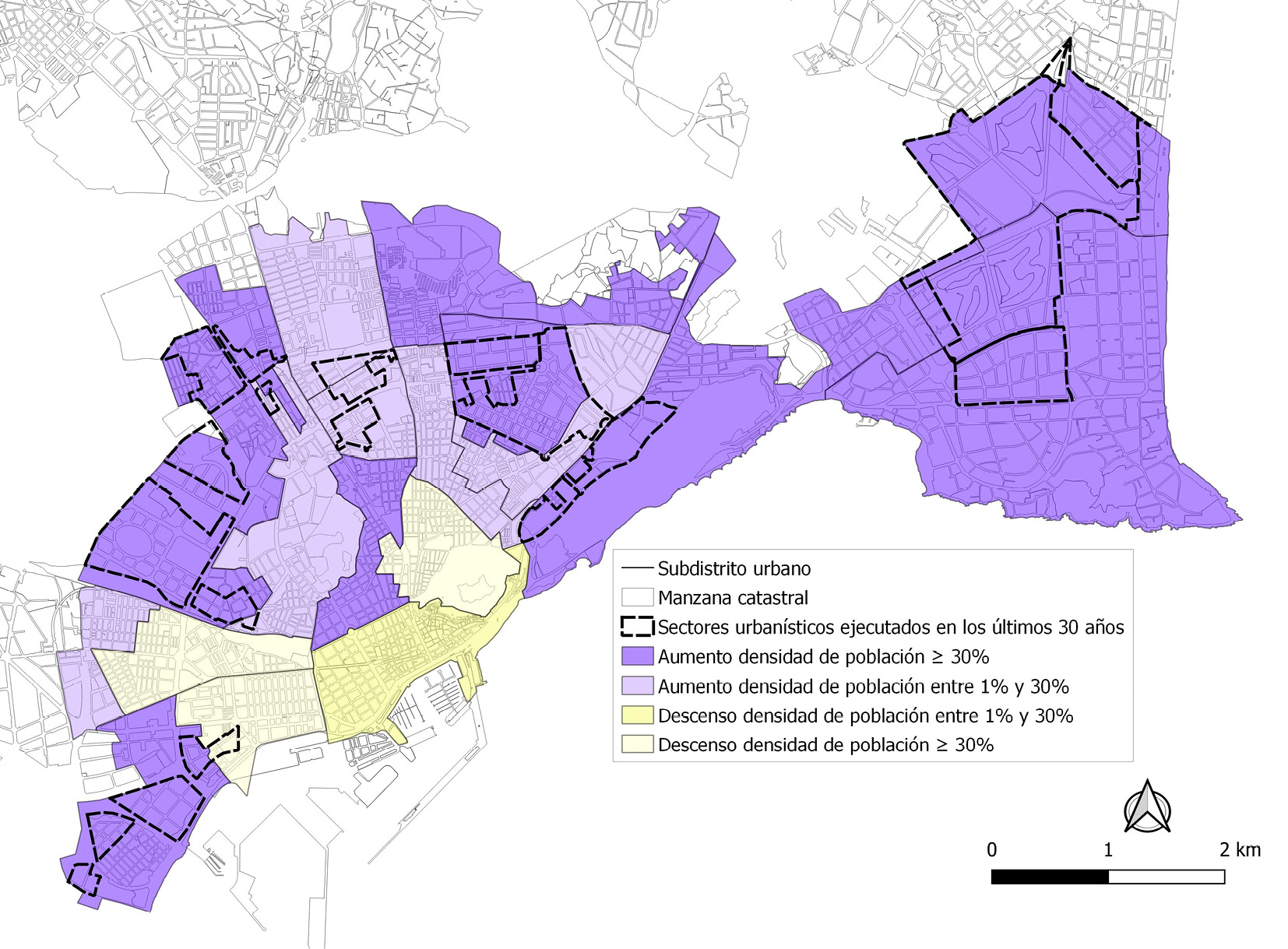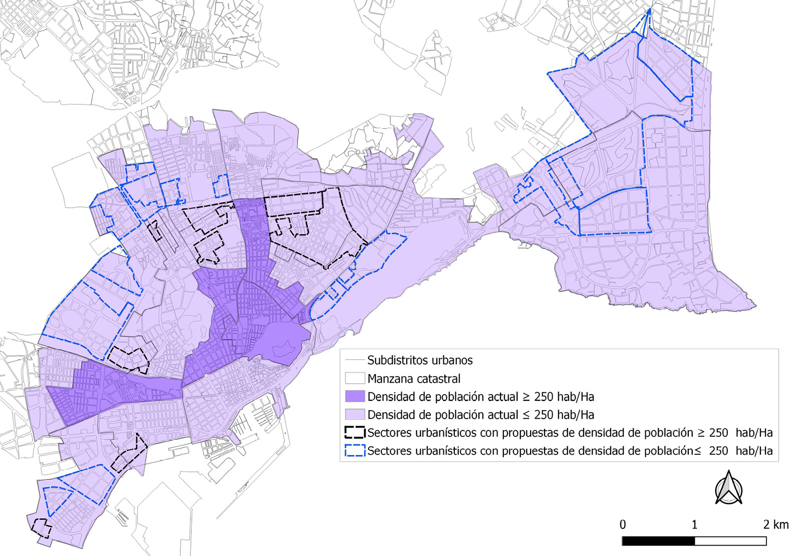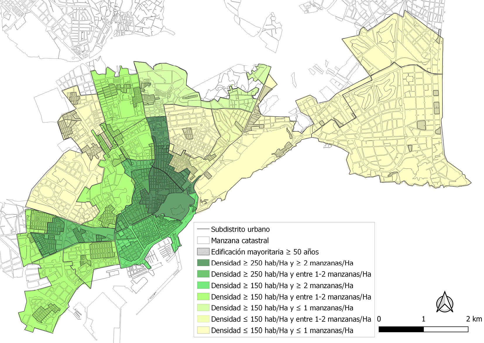 El análisis de la densidad urbana y poblacional a través del planeamiento urbanístico y su influencia en la vida e interacción social se realiza teniendo en cuenta una secuencia metodológica adaptada a unos objetivos para la presente investigación. La definición y el cálculo de las densidades suponen una complejidad manifiesta por la búsqueda y selección del método más apropiado. La elección del método no solo ha de depender del factor cuantitativo, sino de otras cualidades territoriales, socioeconómicas y organizativas dentro de la ciudad (Churchman, 1999; Boyko & Cooper, 2011) que hacen dificultosa esta elección desde la variedad de posibilidades y la falta de concreción precisa de un método mayormente utilizado por los matices y discontinuidades de los diferentes métodos y objetivos de cálculo según el análisis de las diferentes fuentes (Rueda, 2012; Navarro & Ortuño, 2011; Goerlich & Cantarino, 2012; De Nadai, Staiano & Larcher, 2016; García, 2016). En este sentido, el método para la estimación de las densidades poblacionales netas en la presente investigación se realiza a partir de su cálculo en unas unidades urbanas concretas. Los subdistritos urbanos del proyecto Urban Audit se han seleccionado pero ajustados al suelo urbano y suelo urbanizable ejecutado residencial según la clasificación y calificación urbanística del planeamiento y el análisis de los usos del suelo en la actualidad. La menor escala de estas unidades es la adecuada para la presente investigación porque permite un análisis espacial que pueda representar y comparar a escala los límites y extensión de los sectores del planeamiento urbanístico en unas unidades urbanas con patrones homogéneos en cuanto a su morfología y características sociodemográficas y origen urbanístico (López-Jiménez, 2020). Este tipo de análisis permite una cartografía que compara áreas intraurbanas que han evolucionado de forma diferente en cuanto a densidad y forma urbana para mostrar la concordancia entre las propuestas de densidades poblacionales de los sectores urbanísticos de los últimos años y la densidad poblacional actual. Además, este método permite el análisis de las densidades poblacionales con analogía a la densidad urbana para ejemplificar el resultado de una forma urbana más adecuada para la vida e interacción social cuando permite la expansión de los comercios minoristas y las posibilidades de los “terceros lugares”.