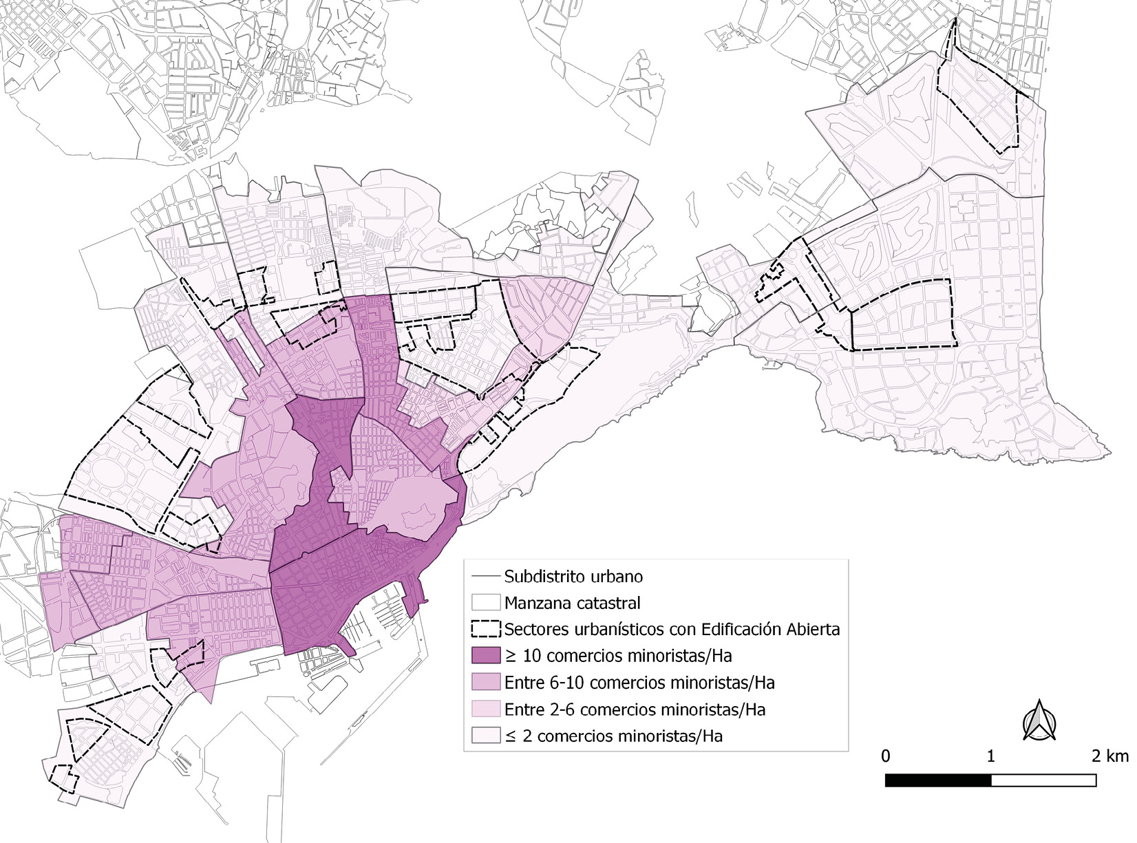 Las densidades en el plan urbanístico se representan a partir de la proyección de una morfología urbana y una tipología edificatoria concreta. La forma urbana fomenta la existencia de la vida e interacción social cuando la misma favorece los tejidos urbanos polifuncionales en un diseño urbano apropiado que permita densidad social y vida en la calle. Por ello, otra cuestión planteada es si las densidades poblacionales se han acompañado de la forma urbana más adecuada, según lo aportado por la literatura conforme a la densidad y complejización urbana, para favorecer la implantación del comercio minorista y los “terceros lugares” como elementos que ejemplifican las posibilidades de vida en interacción social en la ciudad.