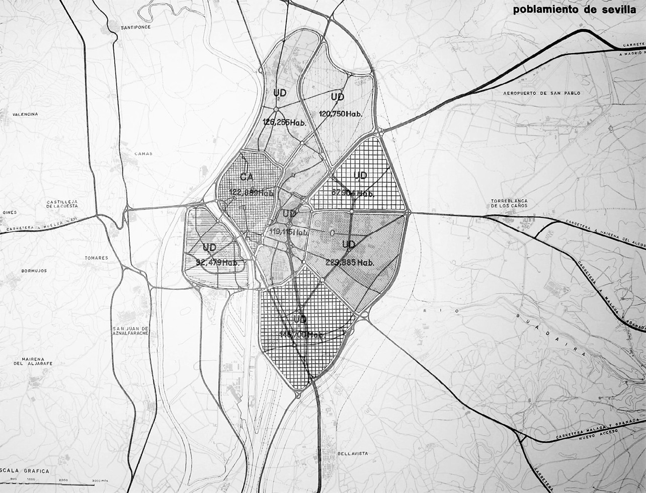La redacción de éste, iniciada a mediados de los años sesenta, aparecía, por tanto, como la consecuencia natural de la primera de las opciones metodológicas planteadas por el Plan General: la fijación de un límite al crecimiento poblacional de Sevilla y la consiguiente remisión a un Plan Comarcal que ordenase el modo en que la población excedente habría de distribuirse sobre el territorio circundante (Sainz, 2010).
