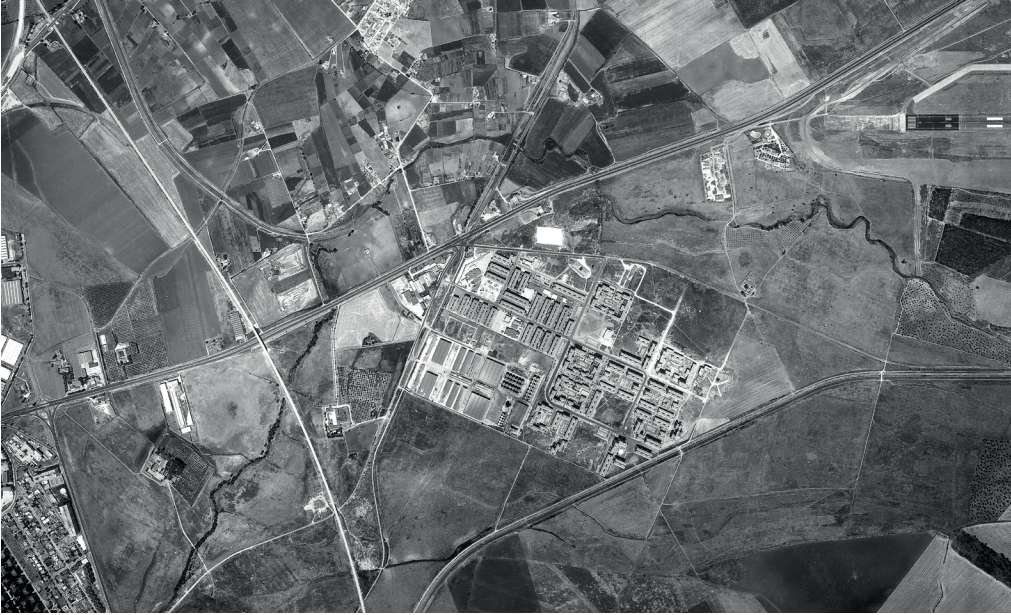 Así, esa permisividad municipal, considerada por Medina como uno de los mayores peligros para un desarrollo ordenado de la capital andaluza, acabaría desvirtuando por completo el modelo propuesto por el Plan General. Fue la iniciativa privada la que actuó como punta de lanza en la ruptura efectiva del modelo, al acometer la construcción del denominado Parque Alcosa4, una promoción de 10 000 viviendas de protección oficial situada en un suelo rústico junto a la entrada de la carretera nacional IV, a modo de ciudad-satélite (Fig. 2). Esa operación, iniciada en 1969, venía a coincidir con la delimitación en sus inmediaciones del que se llamó polígono Aeropuerto, llevada a cabo por la Gerencia de Urbanización del Ministerio de la Vivienda con el propósito declarado de atender a la necesidad de vivienda social existente en Sevilla5.