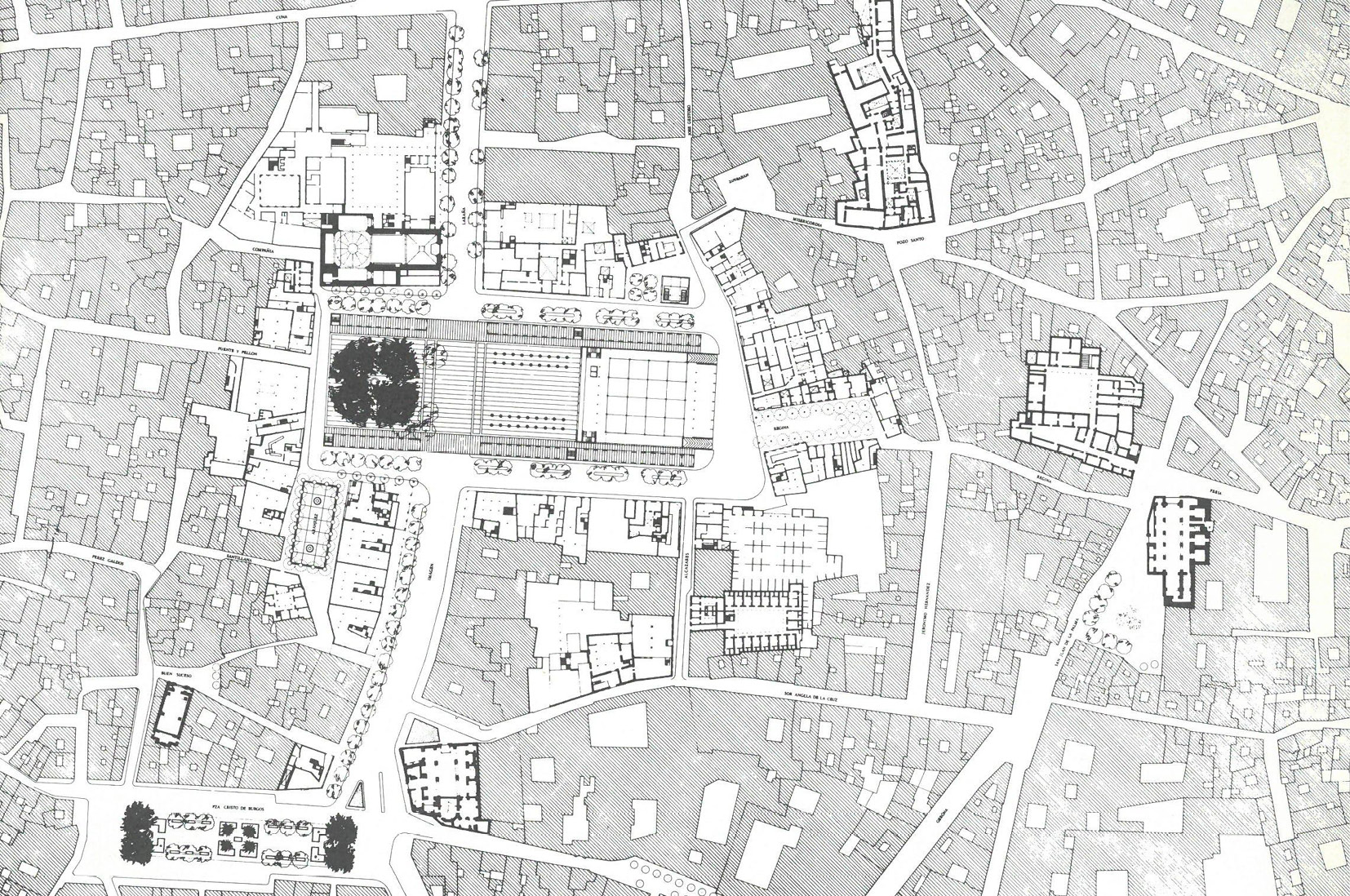 La manzana del solar de la antigua Maestranza de Artillería y del jardín de la Caridad, que también formaba parte del centro comercial de la Carretería previsto en el PRICA, fue delimitada como un conjunto específico en el Modificado de éste. Ese ámbito fue objeto de un Plan Especial que, partiendo del estudio realizado por Félix Pozo, estaba próximo, por su escala y su modo de aproximarse al problema urbano, al ya mencionado de la Encarnación; no obstante, a diferencia lo que allí sucedía, aquí no se trató tanto de llegar a la definición arquitectónica, a través de un “plan-proyecto”, como de plantear unas bases para el concurso de ideas que más tarde se convocaría para proyectar un equipamiento de carácter cultural situado junto al jardín de la Caridad, en los terrenos que por entonces la Diputación había comprado al Ministerio de Defensa23.