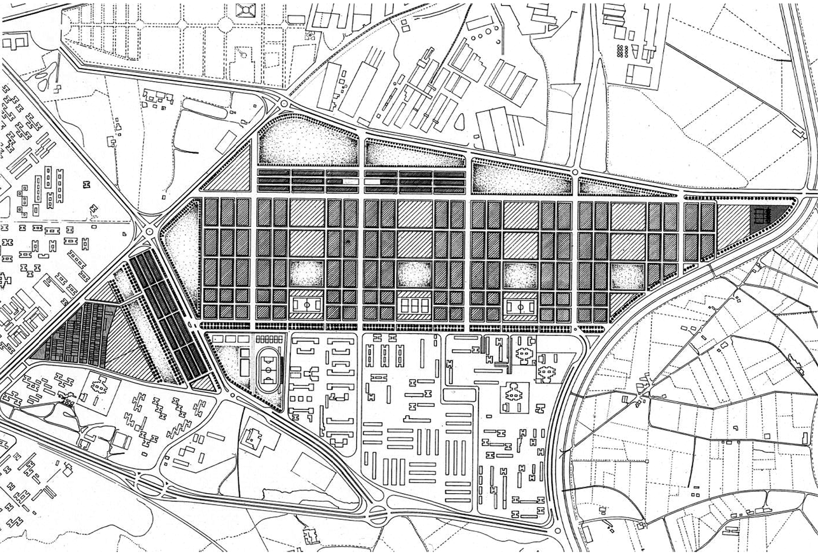 Tampoco en este caso, aunque la iniciativa fuese pública, la actuación tenía acomodo en lo diseñado por el Plan General y, de hecho, habida cuenta de su tamaño6, suponía una ruptura completa con cuanto en éste se había previsto. Desde el punto de vista de la gestión, lo dispuesto era la expropiación de los terrenos, pero la demora en su aprobación propició diversos cambios de manos en la propiedad de los mismos con vistas a rentabilizar su puesta en carga, una vez urbanizados; así, pocos meses más tarde, se acordaba el paso del sistema de expropiación al de compensación mixta, algo que ya había sido contemplado al aprobarse el proyecto expropiador7. No obstante, y a pesar de tratarse de una zona de actuación inmediata para la ejecución del Plan Nacional de la Vivienda (1961-76), el inicio efectivo de la operación se demoraría aún bastante tiempo (Martín, 1996, pp. 287-294).
