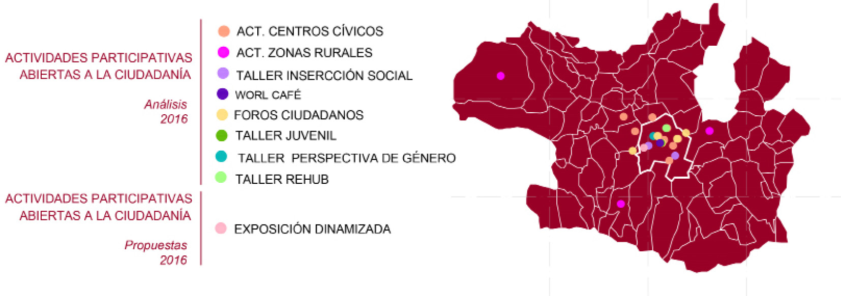 El Ayuntamiento también se valió de un equipo de urbanistas especializados en participación ciudadana para confeccionar un proceso participativo diverso y atractivo. Previamente, se realizó una participación interdepartamental en el Ayuntamiento para que los técnicos municipales propusieran realizar actividades para el público. La Oficina Técnica de Planeamiento decidía la visión que necesitaba conseguir y el Servicio de Participación direccionaba la participación hacia el perfil conveniente, mientras la dinamización de cada taller se externalizaba hacia colectivos o empresas especializadas.