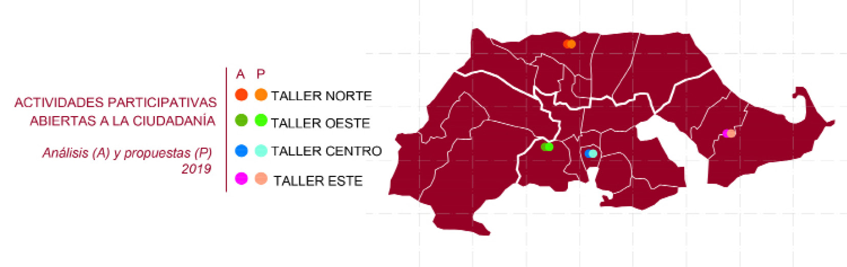 Según se explica en el informe presentado por EAM (2019), en la primera jornada de participación, de las dos que tenía cada taller, se introducía a los participantes en el pensamiento urbano para crear un lenguaje común basado en su propia experiencia de la ciudad. Independientemente del origen y formación, se consideró que todos los participantes tenían experiencia y/o capacidad de reflexión sobre temas urbanos. Los locales contaban con una infraestructura básica y los talleres se organizaron según las preinscripciones recibidas para acomodar a los participantes según un orden de mezcla preestablecida buscando abarcar el mayor grado de pluralidad y diversidad posible de cada mesa de trabajo.