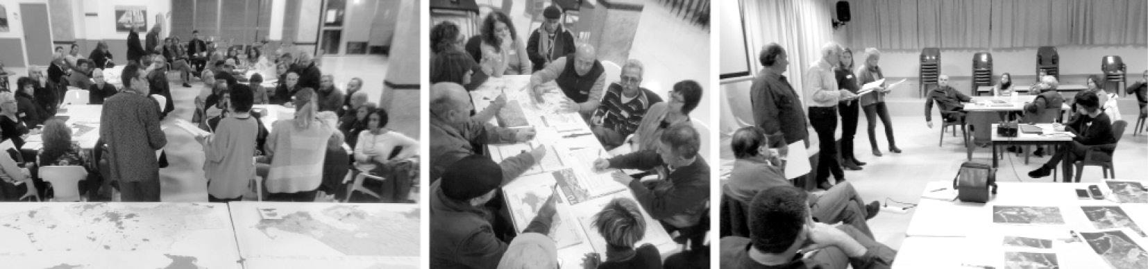 En la concepción del PPC, se decidió desarrollarlo con los ciudadanos en dos jornadas separadas un mes entre ellas, siguiendo dinámicas paralelas con los representantes y los técnicos municipales. La primera se dedicó al análisis, reconocimiento y diagnóstico del territorio, mientras la segunda se centró en la formulación de propuestas. Los talleres vecinales tuvieron lugar entre enero y marzo, desde las 19 hasta las 21h, para no interferir en la jornada laboral. Sin ser imprescindible para participar, en las campañas divulgativas se animó a los interesados a realizar una inscripción previa vía email, aportando datos tales como edad, sexo, ocupación, residencia, situación laboral, ámbito de actividad o pertenencia a alguna asociación. Gracias a ello se previó la afluencia de participantes y, antes de la sesión, se repartieron de forma heterogénea en subgrupos de 6 a 10 miembros para garantizar cierta pluralidad en los debates grupales, resultando reflexiones más enriquecedoras. En el trascurso de los talleres los miembros de EAM guiaron las dinámicas, pero permitiendo el trabajo autónomo de cada subgrupo y fomentando la participación de todos los asistentes. En este sentido, se insistió en que todas las aportaciones eran válidas tratando de favorecer la comunicación y el aprendizaje mutuo.