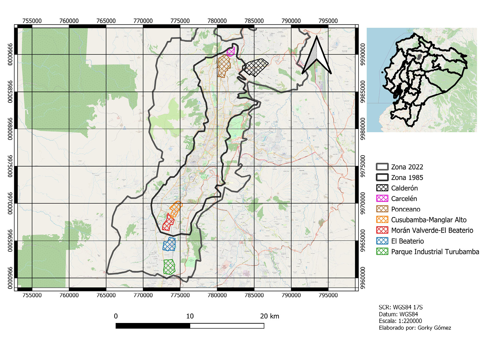 Fig. 1/ Plano general de Quito 1985–2022, Zonas urbano-industriales al sur y norte de Quito