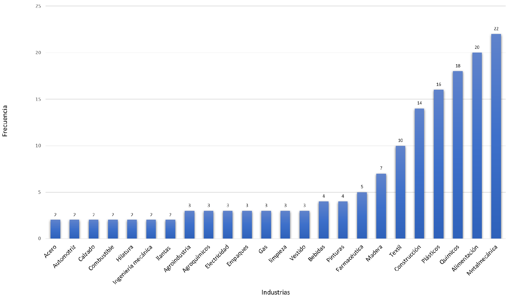 10 En la Fig. 6, no constan 25 fábricas cuya frecuencia es igual a uno, cuyas actividades productivas, tienen relación con la producción de cajas de cartón, confites, colchones, frascos y ampollas, material didáctico, metalización, cerámica, tornillos, transporte de combustible, entre otras.