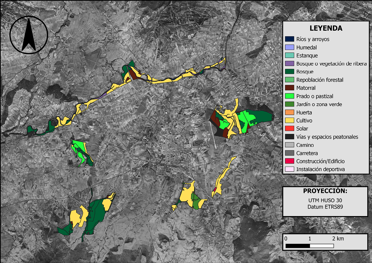 Además, desde la página web del Centro Nacional de Información Geográfica (CNIG, 2020) se han descargado las ortofotos PNOA (Plan Nacional Ortofotografía Aérea, 2020) para diferentes años. Partiendo del mapa actual de usos del suelo se han realizado los procesos de fotointerpretación para los cuales se ha empleado el programa QGIS. A partir del mismo se han reflejado los distintos usos del suelo así como la extensión de cada categoría, de manera que se han podido atestiguar las cantidades de pérdidas y ganancias de cada categoría de la leyenda en hectáreas y por sectores.
