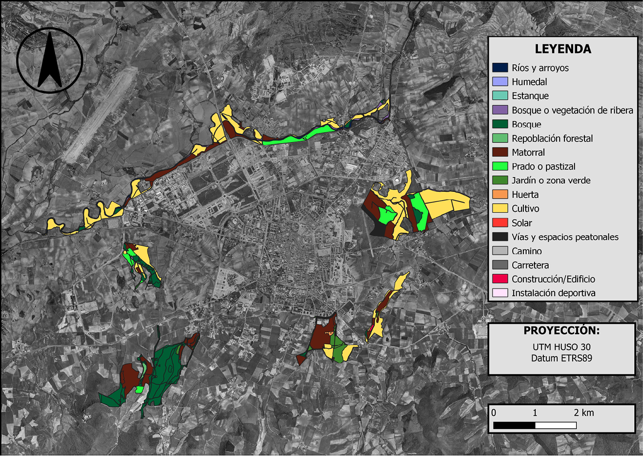 Los documentos cartográficos sobre los que se ha trabajado se incluyen dentro de la cartografía temática que representa los usos del suelo del territorio de estudio y muestran las siguientes categorías: acera, estanque, camino, carretera, cultivo, instalación deportiva, construcción/edificio, matorral, bosque de ribera o vegetación de ribera, huerta, humedal, jardín o zona verde urbana, bosque, repoblación forestal, prado o pasto, río y/o arroyo y, por último, solar (es decir, parcela sin uso definido). Por lo tanto, como se ha dicho anteriormente, se ha tomado como referencia la misma leyenda de la mayor parte de los documentos cartográficos realizados por el Ayuntamiento de Vitoria-Gasteiz. No obstante, los colores y la propia leyenda han sido adaptados a las necesidades y unidades del trabajo que se presenta a partir de la propuesta de Gisandbeers (2020).