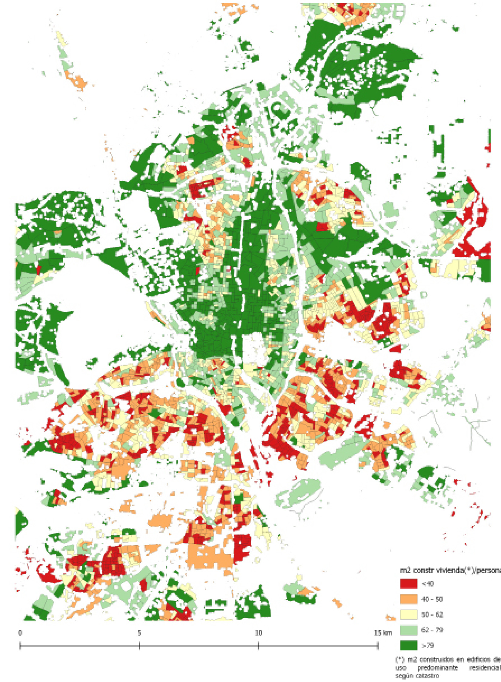 Fig. 5/ Plano que muestra la relación entre la superficie construida en m2 en edificios de uso predominante residencial por persona, con grandes diferencias entre las zonas norte y sur de Madrid.