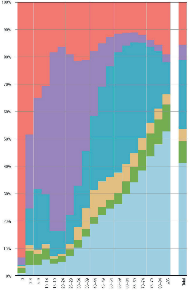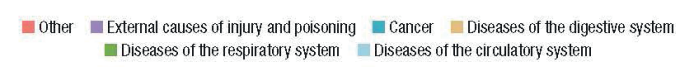 En el eje horizontal la edad de las personas y en el vertical el % de mortalidad. Otras causas (rojo); Causas externas de heridas y envenenamientos (violeta); cáncer; (azul oscuro) enfermedades del aparato digestivo (marrón); enfermedades del aparato respiratorio (verde) y enfermedades del aparato circulatorio (azul).