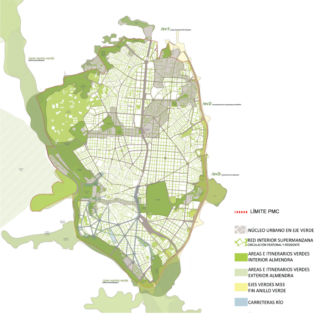 El nuevo sistema verde se vertebrará en torno a la recuperación del río Manzanares -que a su vez constituye el vínculo con los grandes espacios naturales de la región de Madrid- conectando las grandes piezas verdes del interior de Madrid, a través de una trama capilar de calles peatonales y plazas hasta configurar verdaderos corredores ambientales en el interior de la ciudad, que se verían reforzados con la incorporación de la naturaleza al propio tejido construido: jardines verticales y cubiertas verdes. La Fig. 11 muestra esta estructura de revegetación de Madrid.
