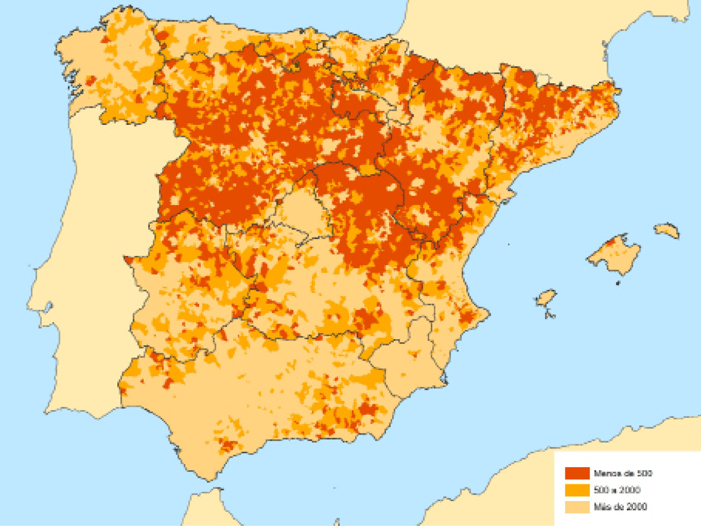 Decir medio rural exige definir un campo concreto de estudio, entre la diversidad de situaciones que se dan en él. En nuestro caso, las investigaciones que se presentan en este artículo abordaron de forma general el universo de los municipios con menos de 2000 habitantes, centrándose con particular atención a los municipios con menos de 500 habitantes, calificados como “municipios menores”. Prácticamente la mitad de los municipios de España corresponderían a esta categoría, un porcentaje que se eleva sensiblemente en el caso de las Comunidades Autónomas de Castilla y León, La Rioja y Aragón, y que es también notable en Castilla-La Mancha y Navarra (Fig. 1).