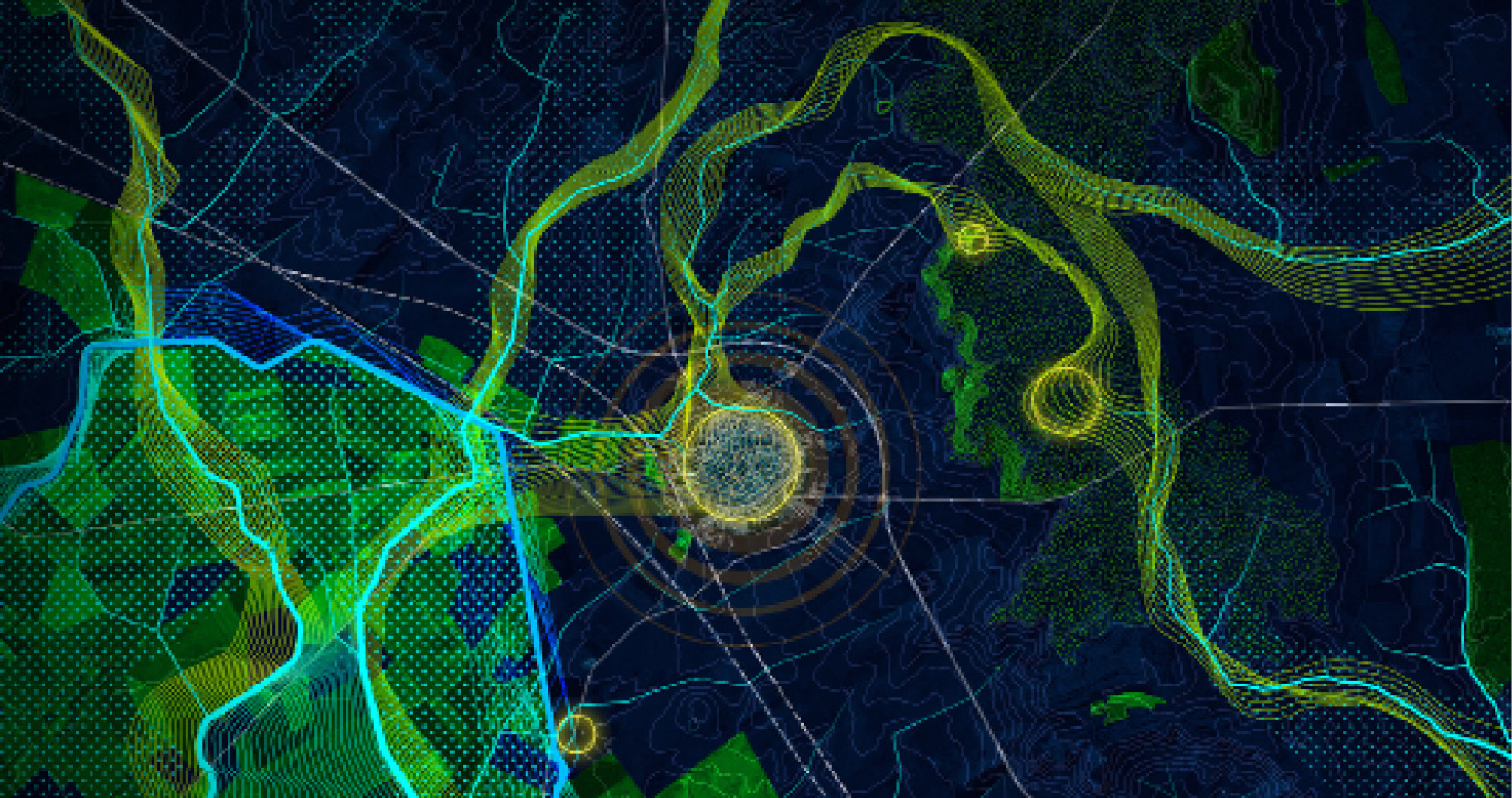 Fig. 10/ Estudio del paisaje intermedio en el entorno del núcleo de Paredes de Nava (Palencia), destacando la estructura secundaria de caminos y pequeños cursos de agua (arroyos). Hipótesis de geometría relacional que articula ámbitos paisajísticos (regadíos, pueblo, secano y monte bajo) con conectores lineales potenciales (Canal de Castilla, arroyos, caminos, laderas…).