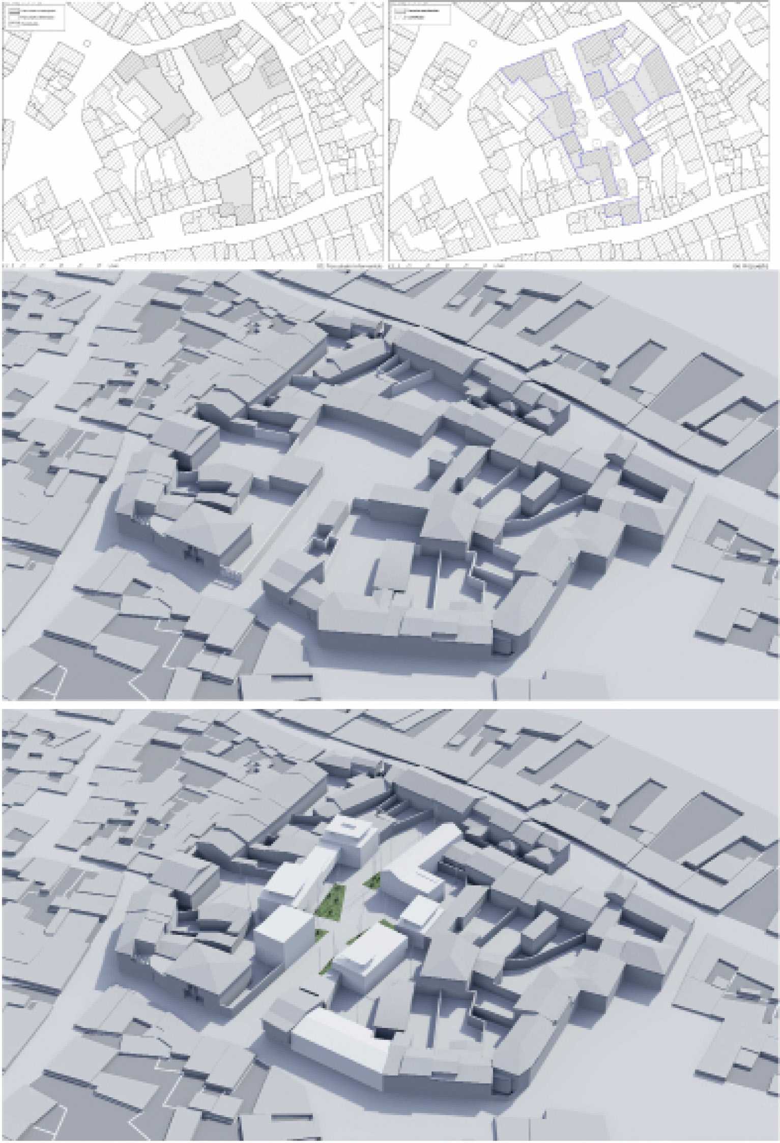 Fig. 13/ Estudio de caso-situación en Paredes de Nava (Palencia): intervención sobre cinco parcelas de una manzana interior. Resultado: siete nuevas edificaciones y tres conservadas; nuevo espacio público y equipamiento. Acción viable desde la normativa y gestión urbanística vigentes, con edificabilidad por debajo de la hoy permitida, control de la escala e innovación tipológica moderada.