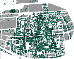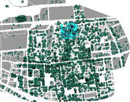 En la Fig 2 se muestra la distribución geolocalizada de los entes urbanos organizados, en concreto 3566 personas jurídicas de una parte del municipio del Prat del Llobregat (Barcelona) y en la Fig 3 se ha realizado una selección de dichos entes (en azul).