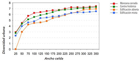 Fig 6/ Diversidad urbana y ancho de celda óptimo para tejidos de distintas morfologías urbanas.