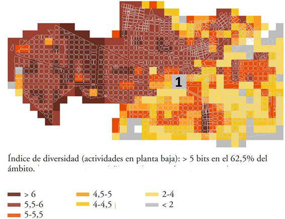 El índice de diversidad urbana, para un área determinada, será mayor cuanto más actividades, equipamientos, asociaciones e instituciones estén presentes y más diferenciadas sean entre ellas. Permite identificar la diversidad y mixticidad de usos y funciones urbanos, el grado de centralidad y, en algunos casos, de madurez de un territorio y de los lugares con mayor concentración de actividad y, por lo tanto, de generación, entre otros, de un mayor número de desplazamientos.