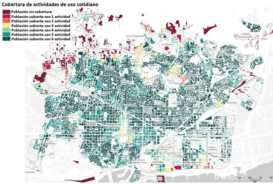 La combinación de compacidad y complejidad conforma un urbanismo de proximidad que reduce de manera significativa el porcentaje de viajes en coche. En Barcelona, los desplazamientos internos en vehículo privado son del 16 %, por el contrario, los viajes en modos de transporte alternativos al coche del 84 %. El modelo urbano de morfología compacta y mixto en usos se manifiesta como el modelo más adecuado para aumentar el número de viajes de movilidad activa alcanzando porcentajes de viajes a pie o en bicicleta por encima del 50 %. Del mismo modo la combinación de valores elevados de CA y H en tejidos residenciales da lugar a porcentajes de viajes en transporte privado por encima del 35 %.